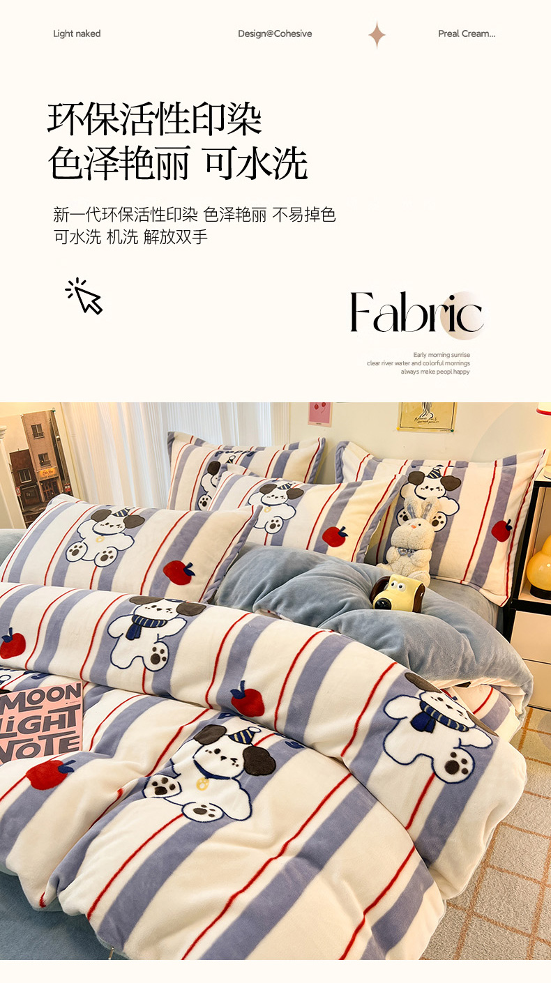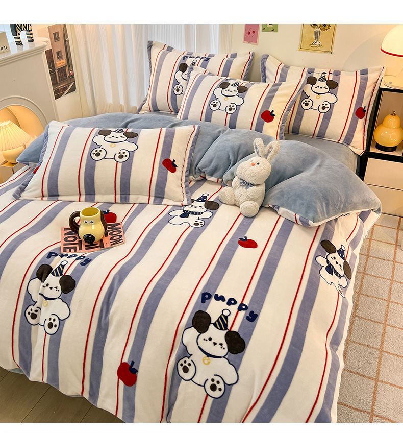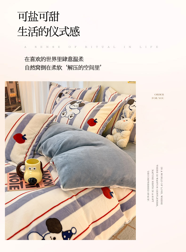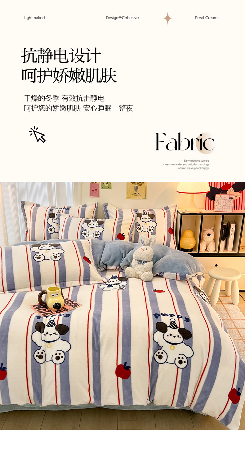 当前位置: 91家纺网 > 商品网购 > 床品套件 > 四件套 > 牛奶绒四件套 > 2024新款A类高克重时尚风牛奶绒加厚保暖系列套件单品-四件套 苹果小狗