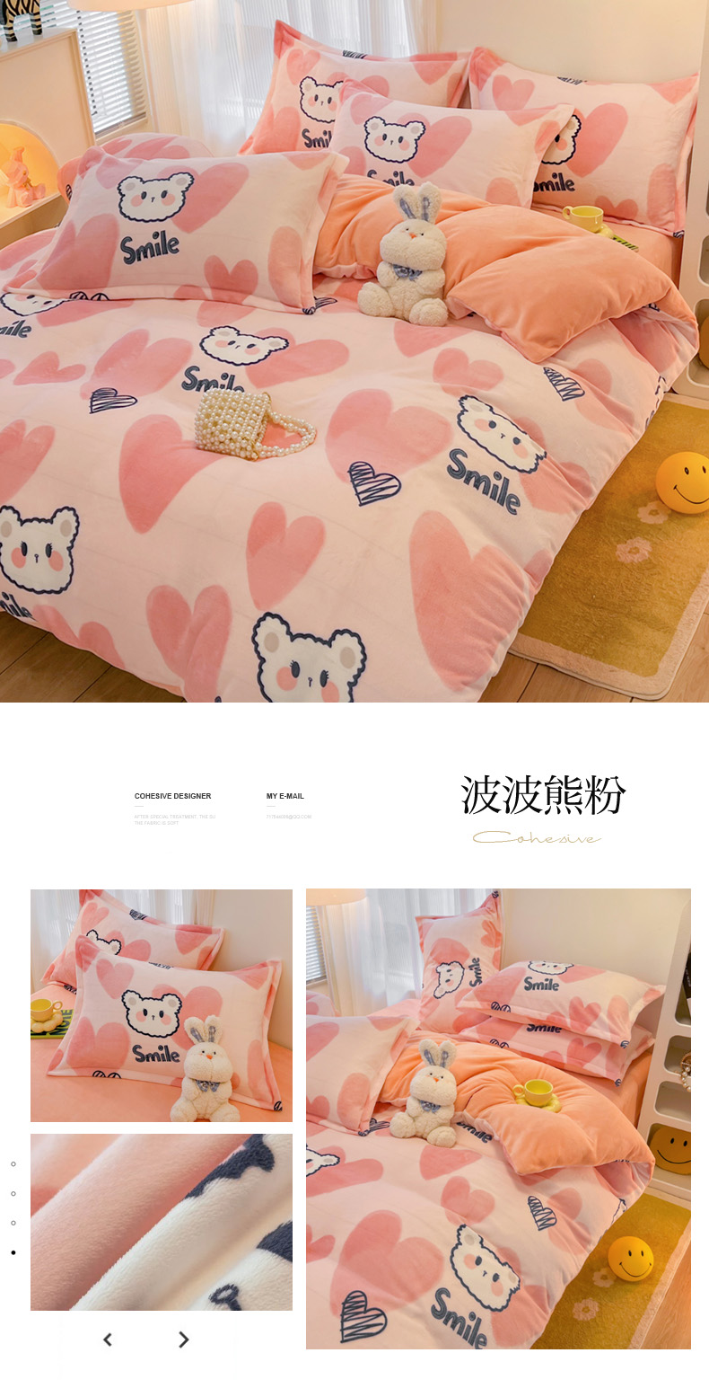 (总)倾慕家纺 2025新款卡通毛巾绣加厚保暖牛奶绒四件套,爱心女孩,咖啡小狗,猫咪熊兔,迷你小车,圣诞树熊,音乐企鹅
