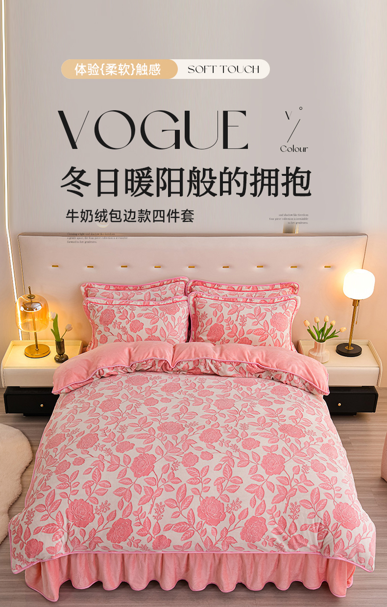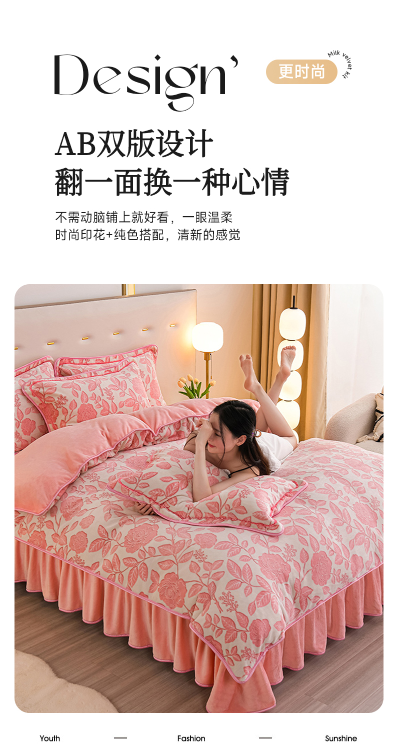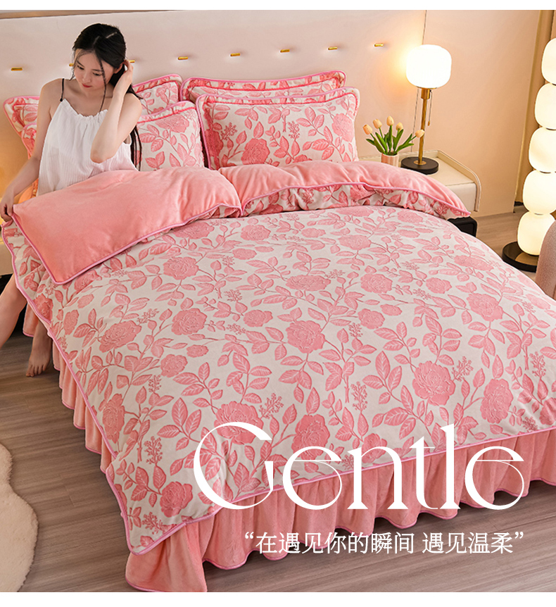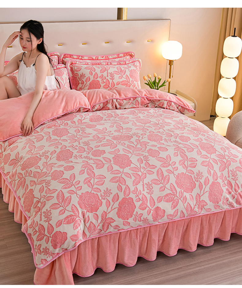 商品名称:赫本家纺 2025新品8-9斤爆品牛奶绒四件套床裙款金雕绒法莱绒四套件 爱意浓-粉