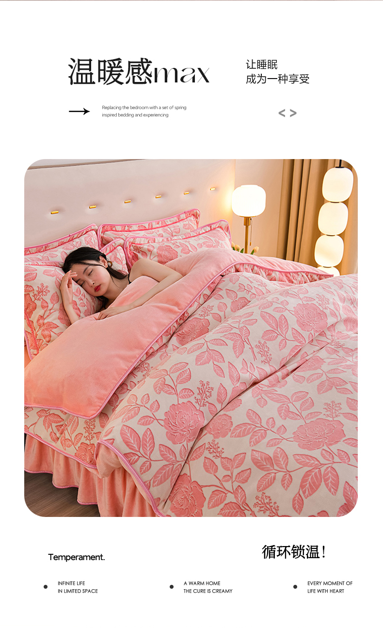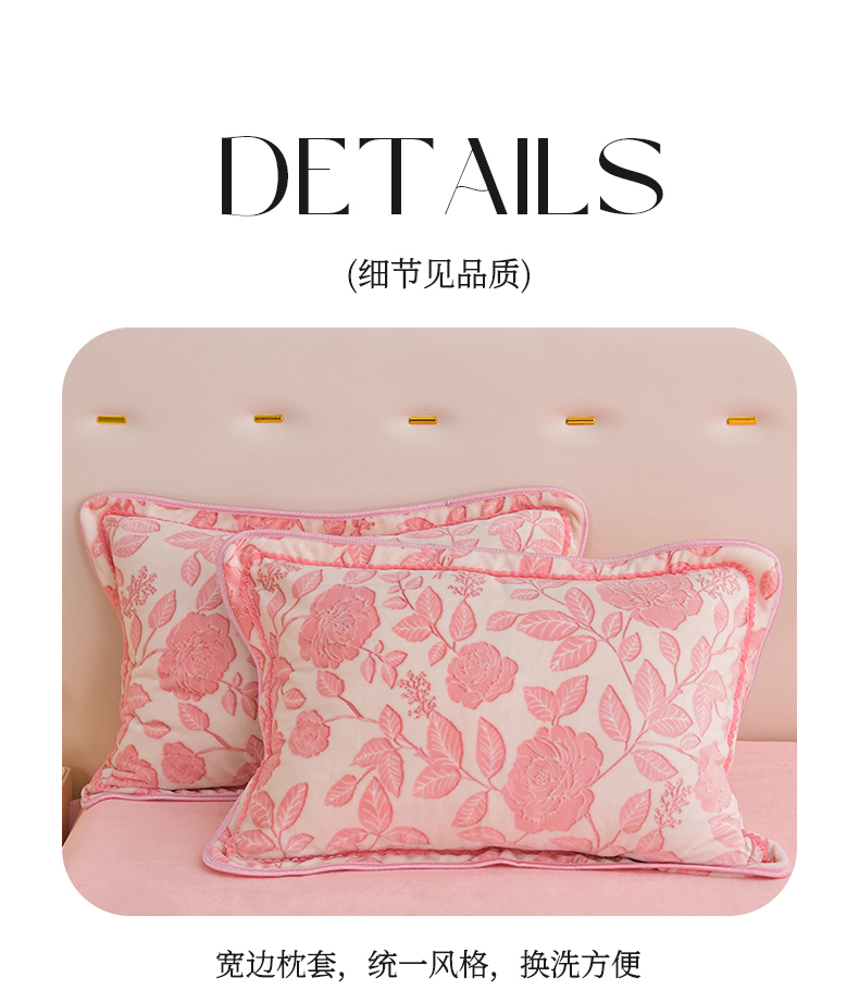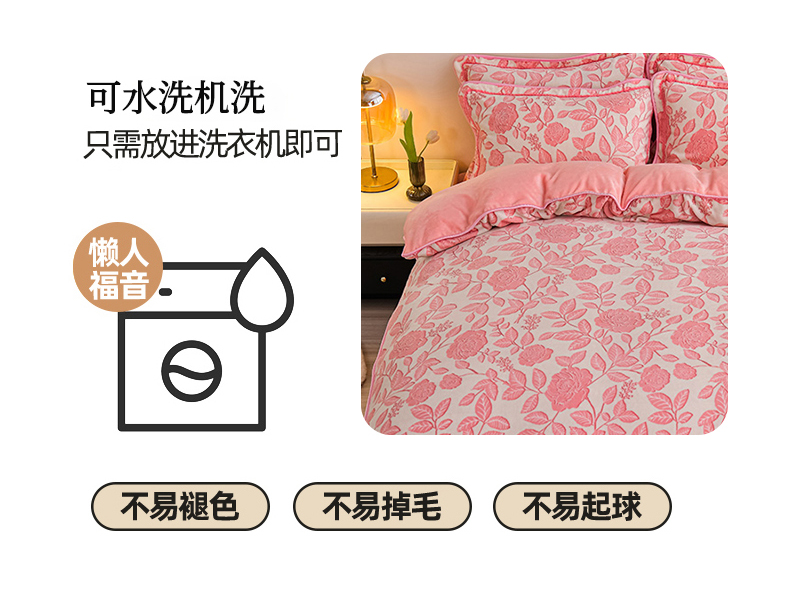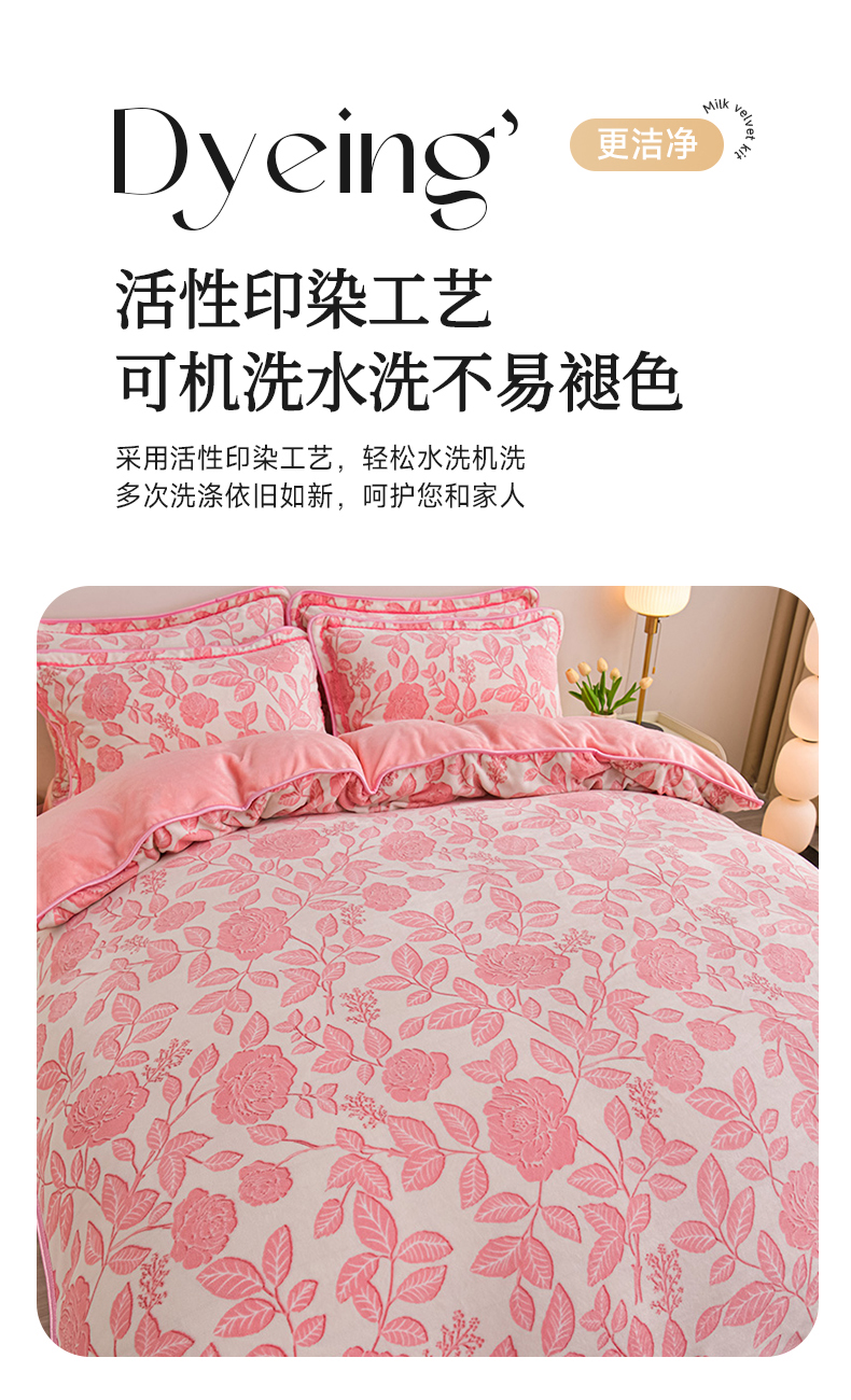 商品名称:赫本家纺 2025新品8-9斤爆品牛奶绒四件套床裙款金雕绒法莱绒四套件 爱意浓-粉