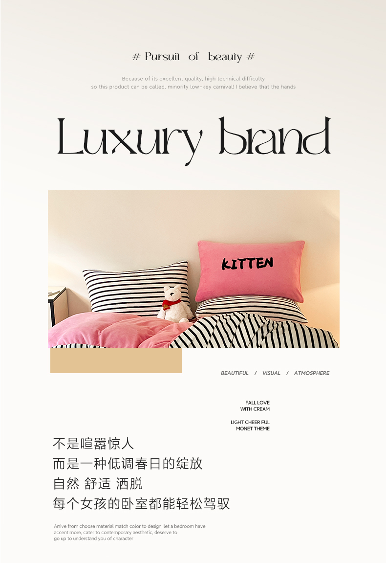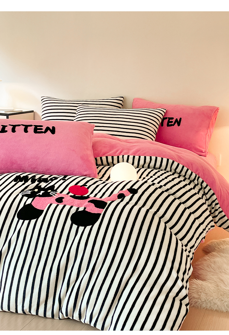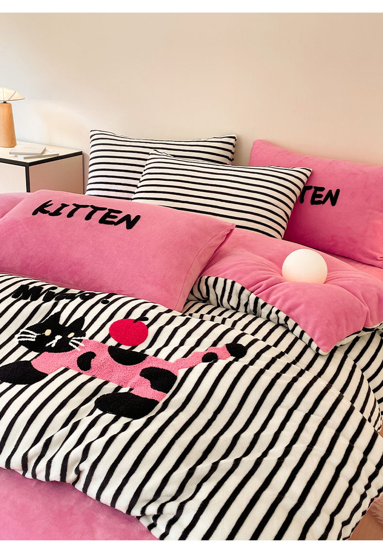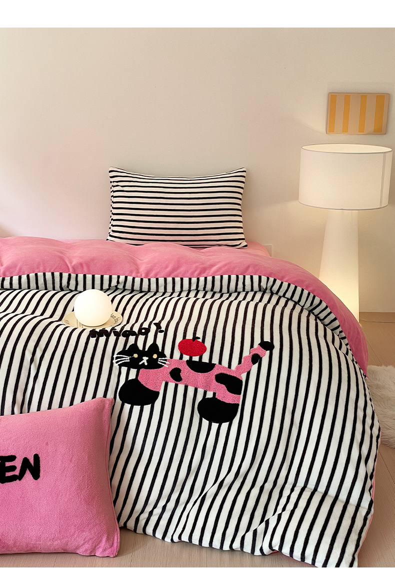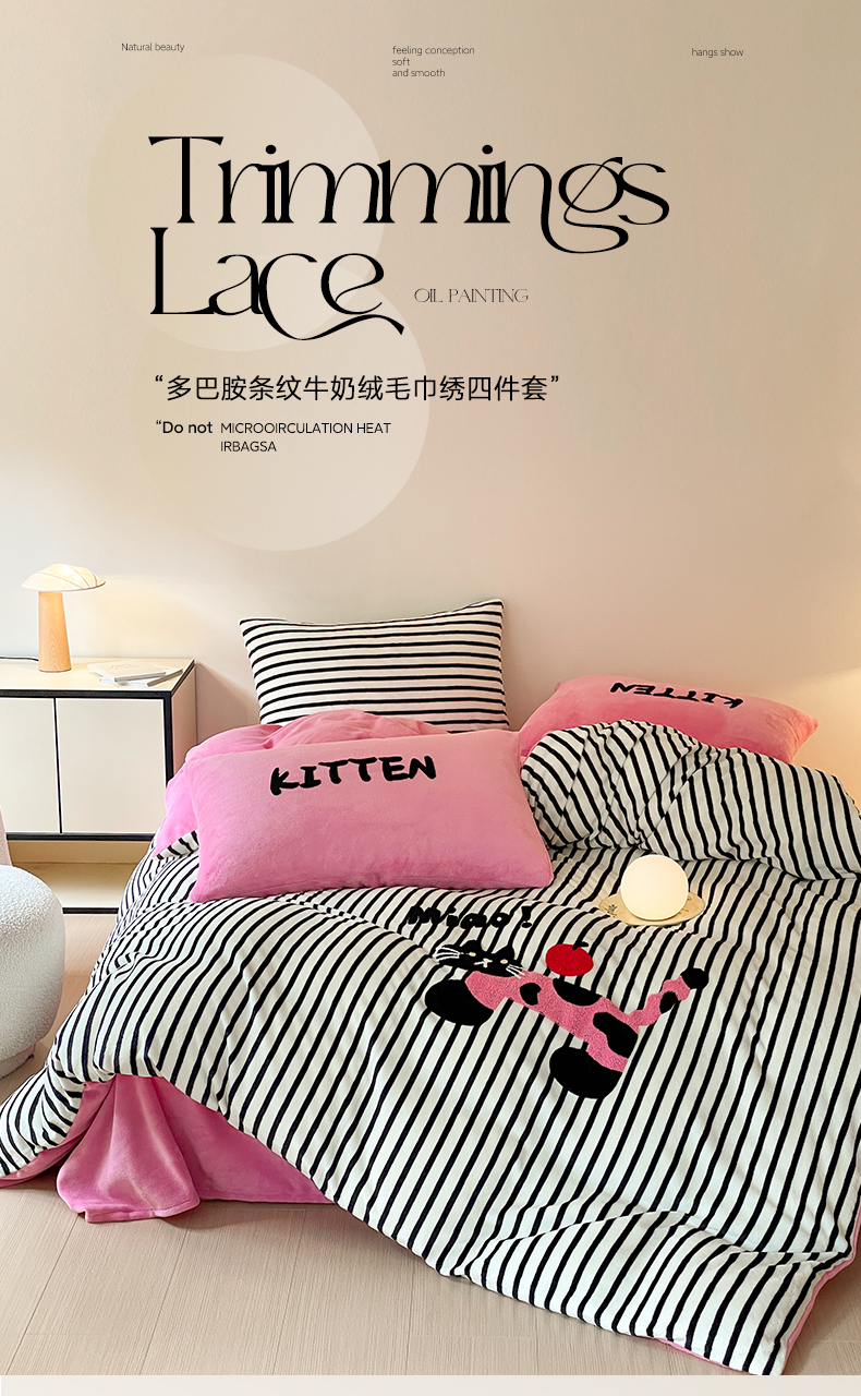 如一 2024新款元素毛巾绣条纹牛奶绒四件套 小黑猫