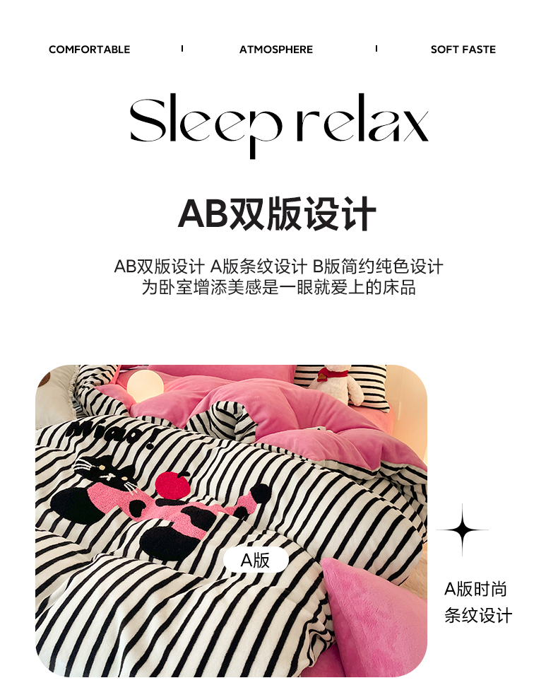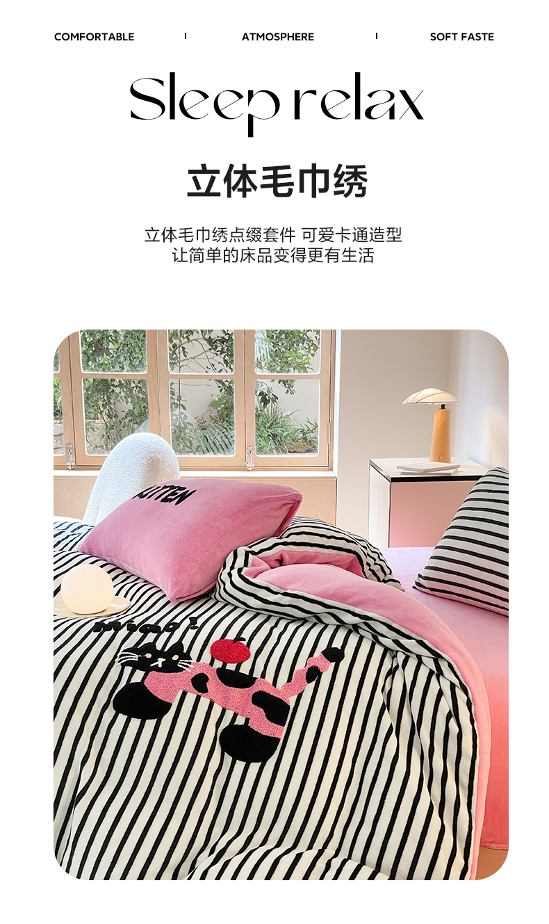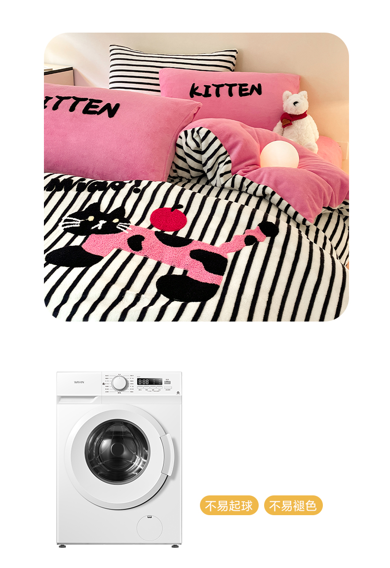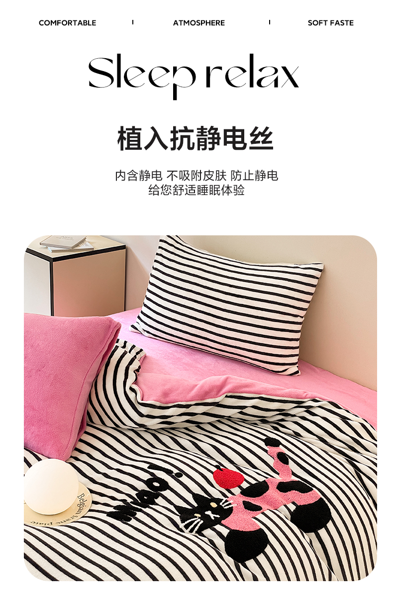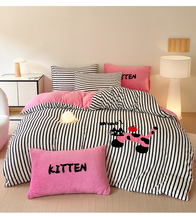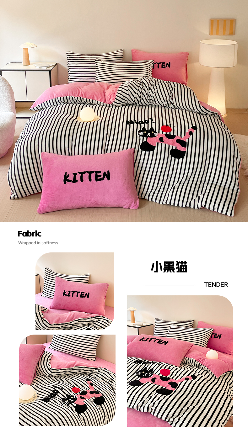 商品名称:如一 2024新款元素毛巾绣条纹牛奶绒四件套 小黑猫