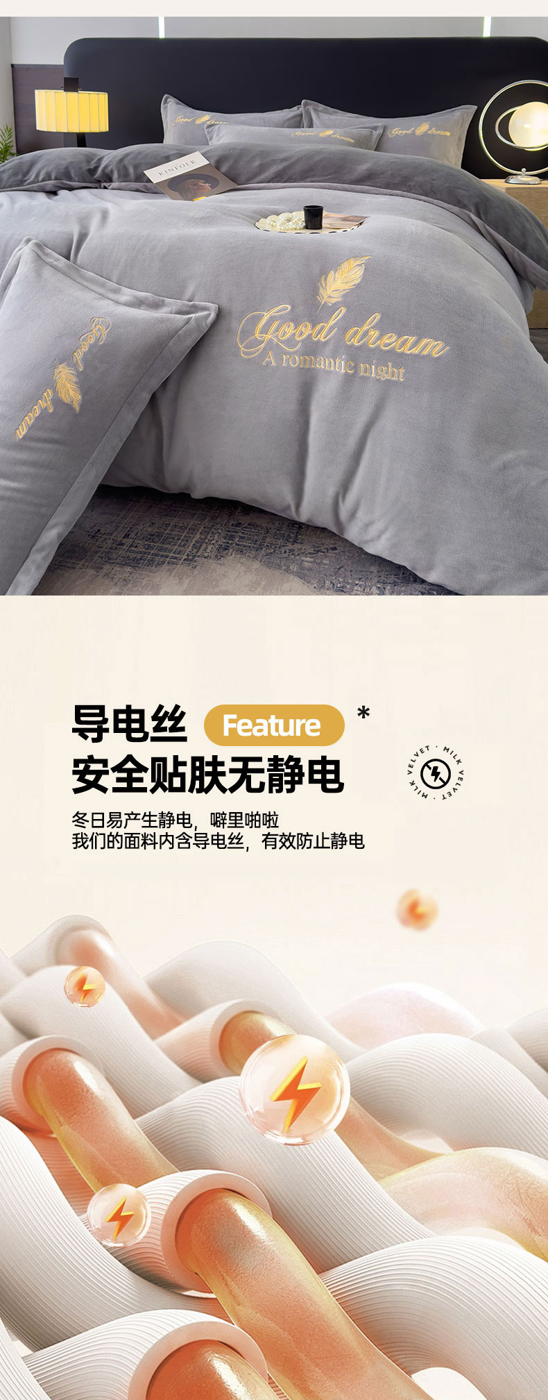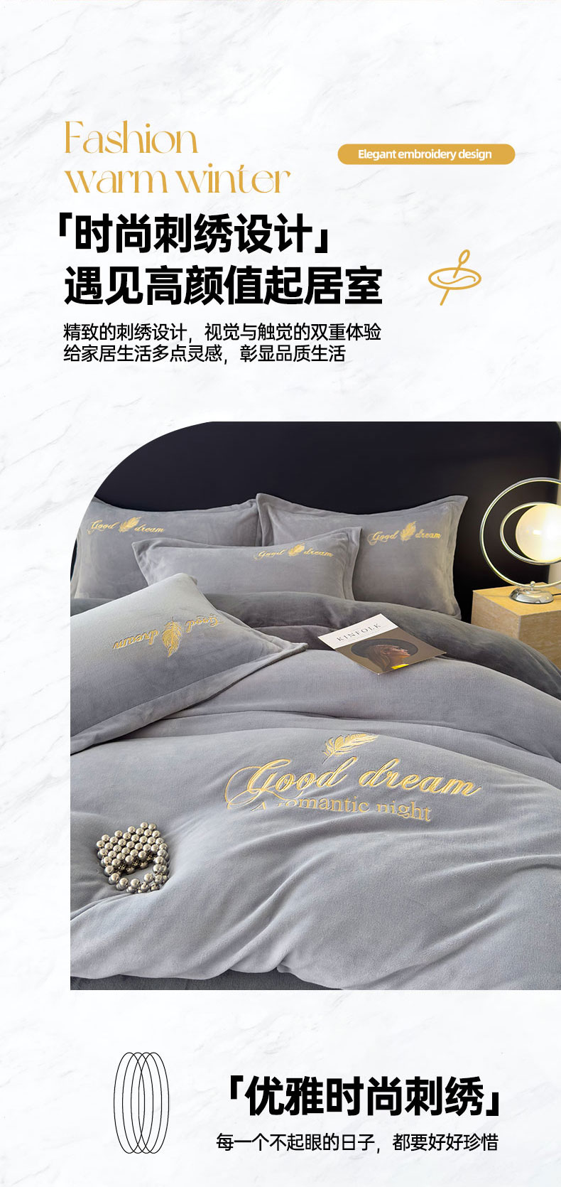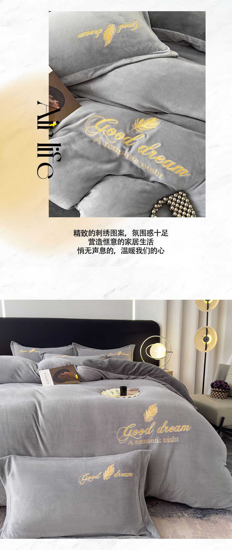 当前位置: 91家纺网 > 商品网购 > 床品套件 > 四件套 > 牛奶绒四件套 > 灰鲸 2025新款A类牛奶绒轻奢刺绣四件套 轻羽-纳多灰+山灰