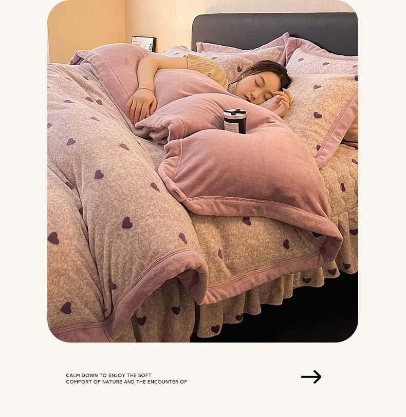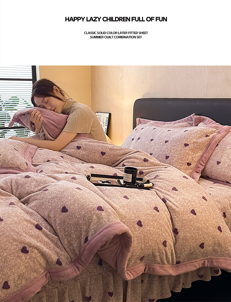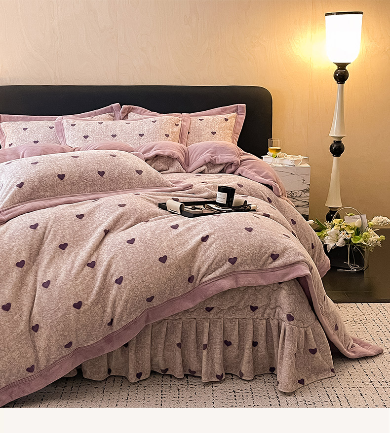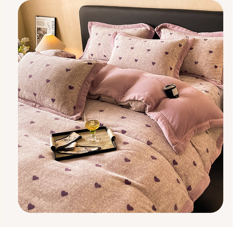 茉保家纺 2024新款包边款印花牛奶绒床盖四件套 爱心(紫)