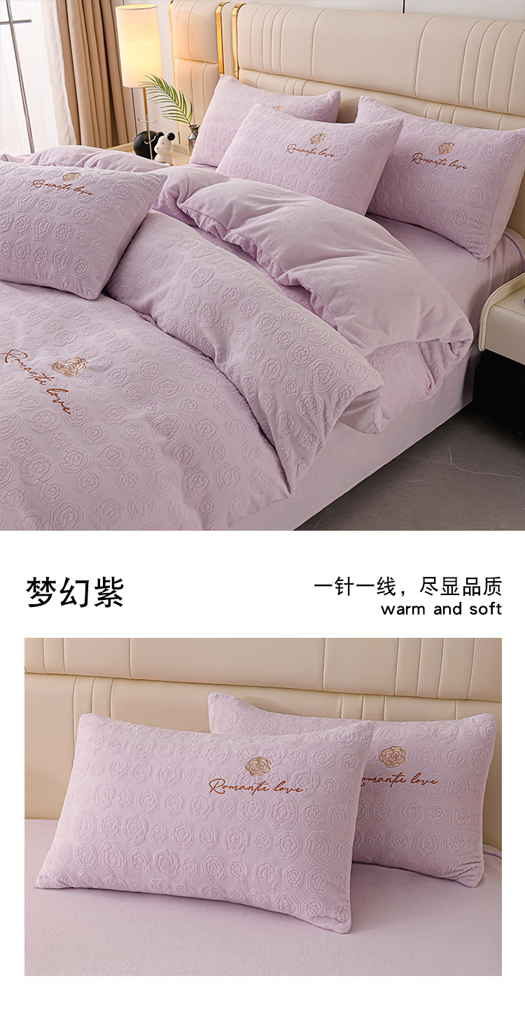 商品名称:眠多宝 2024新款纯色牛奶雕花绒刺绣四件套 梦幻紫