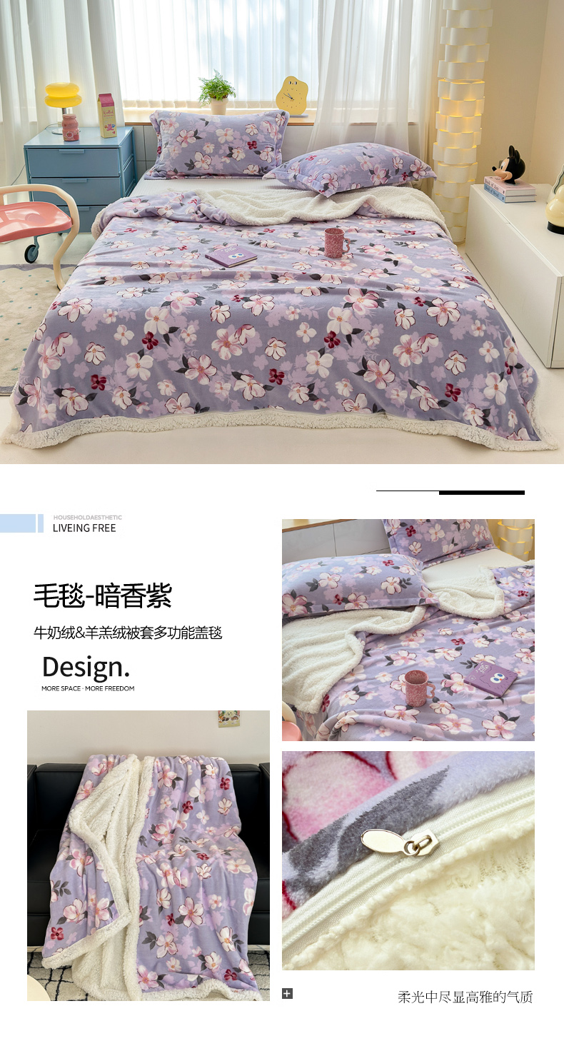 花伞家居 2024直播新款牛奶绒羊羔绒多功能复合拉链被套款毛毯 毛毯-暗香紫