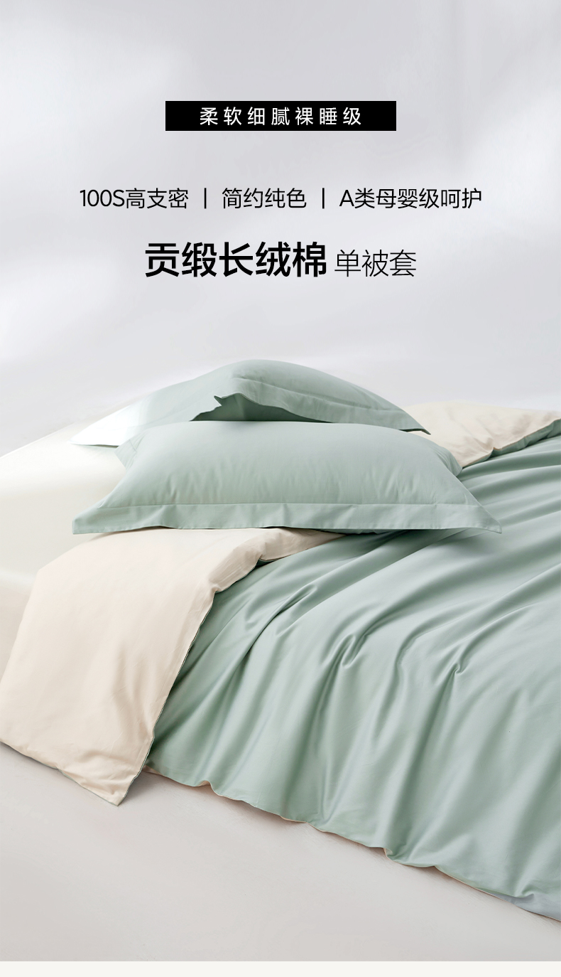 当前位置: 91家纺网 > 商品网购 > 床上用品 > 被套 > 轩和家居 2024新款A类50S贡缎长绒棉单被套系列 薄荷绿+奶芋黄