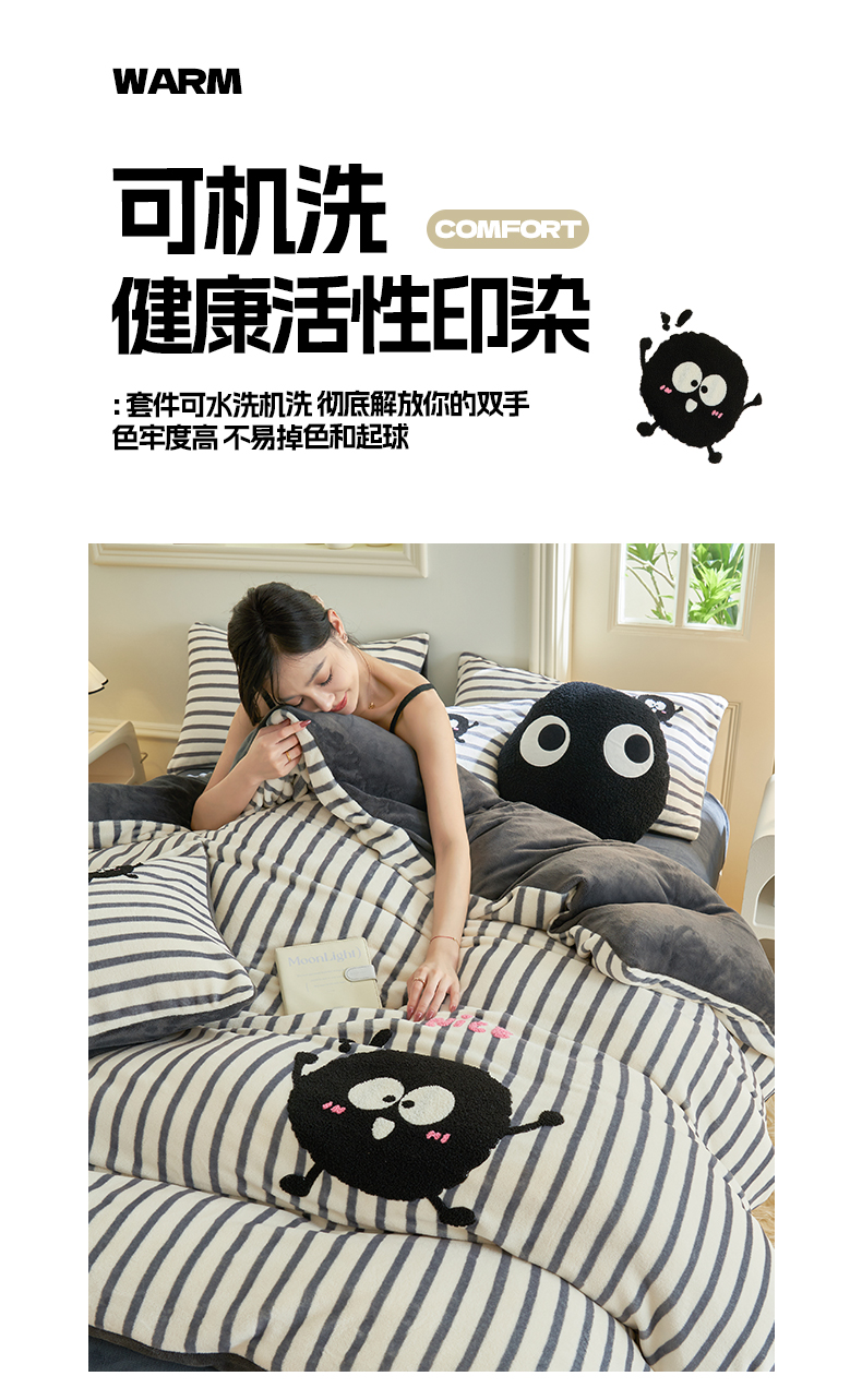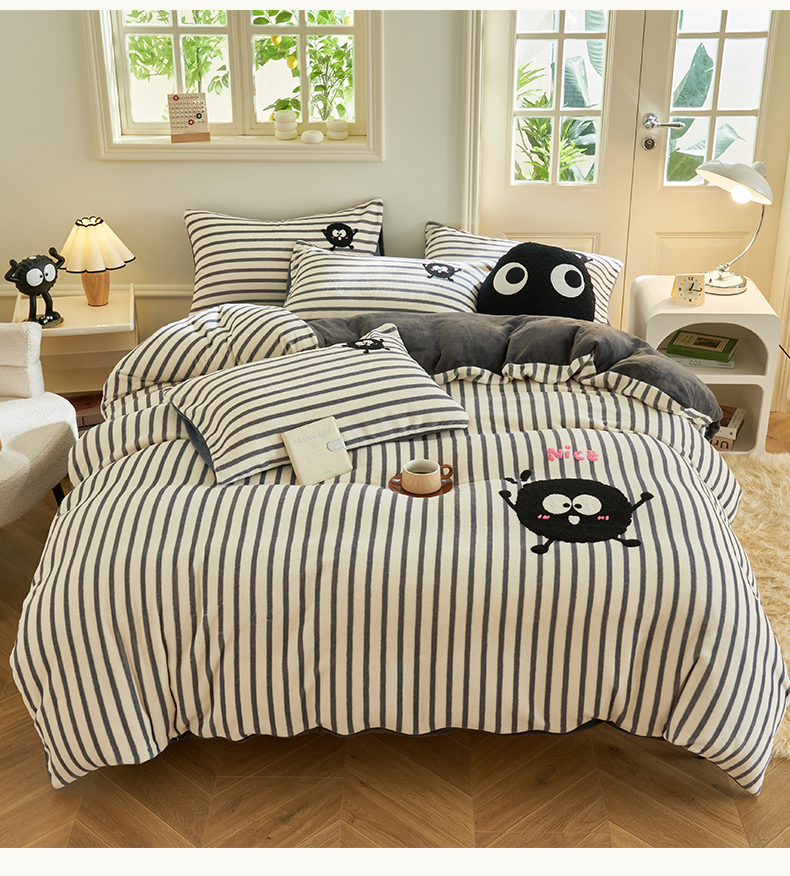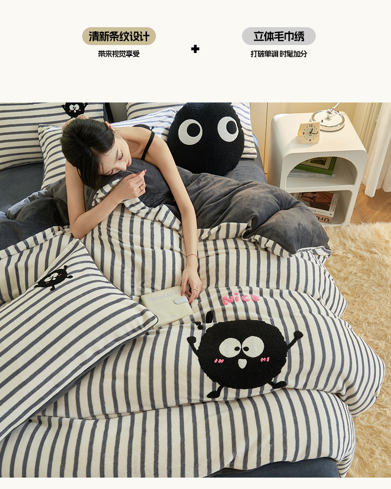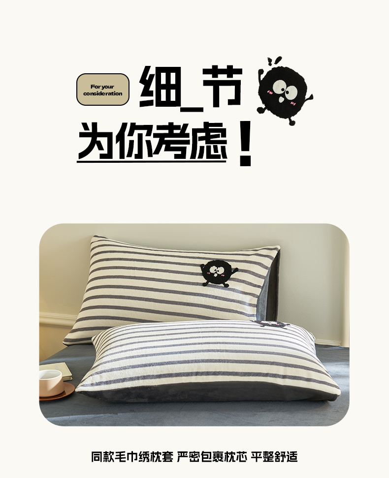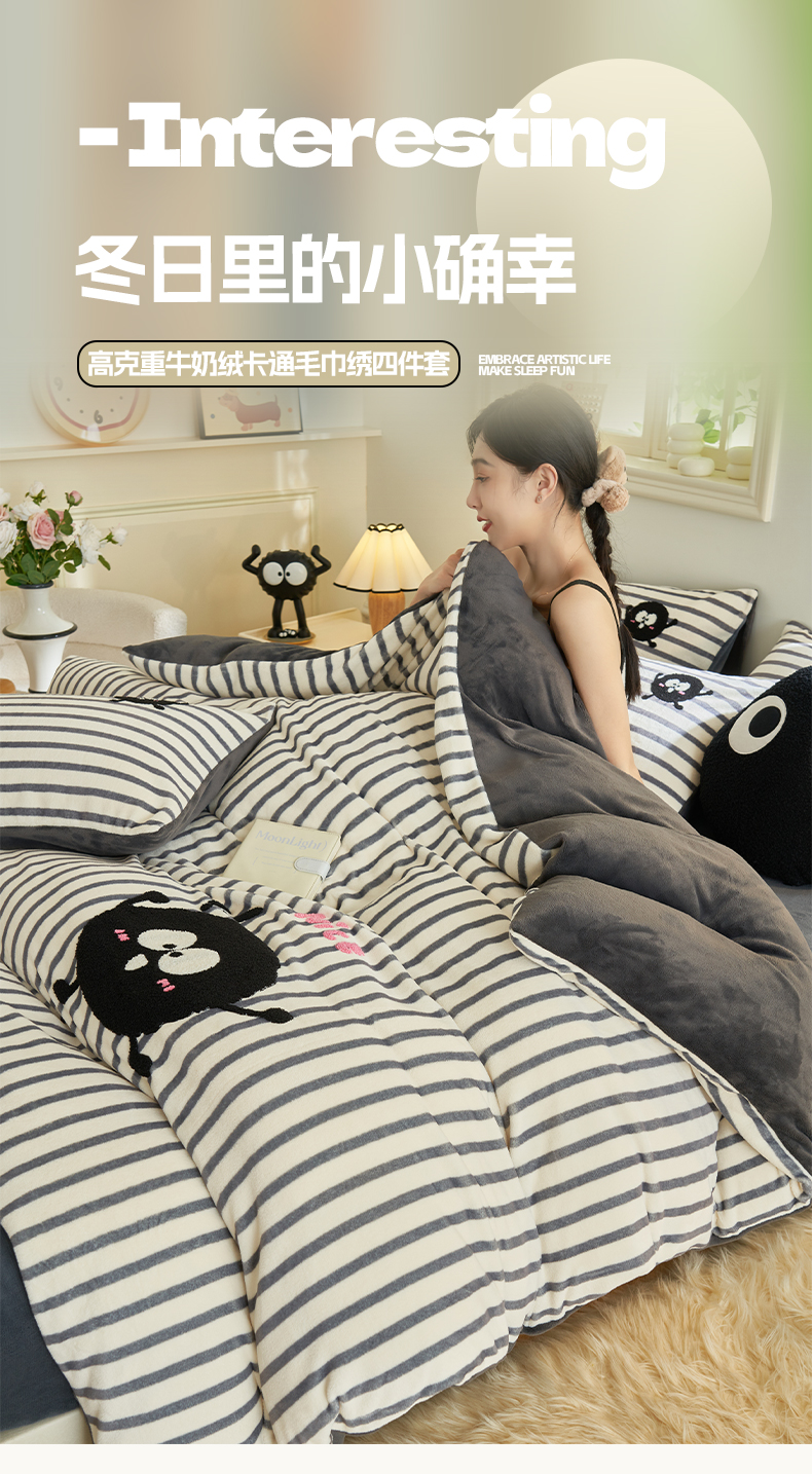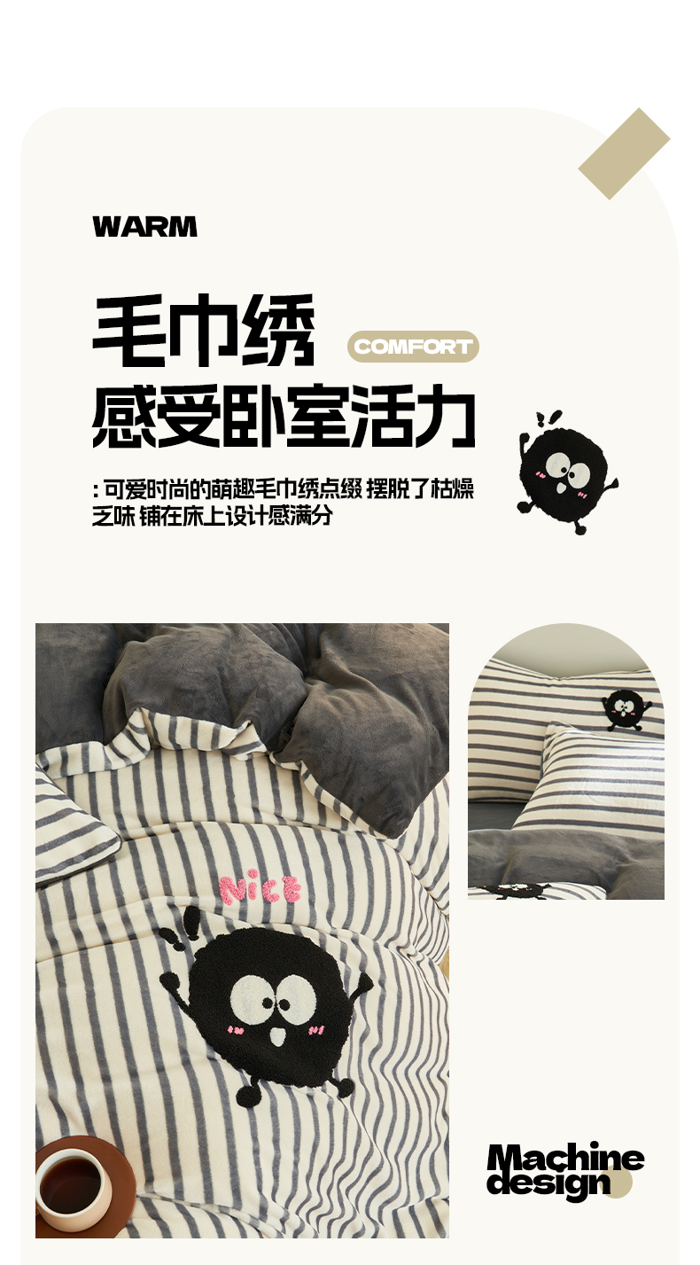 当前位置: 91家纺网 > 商品网购 > 床品套件 > 四件套 > 牛奶绒四件套 > 晨曦家纺 2024新款卡通毛巾绣牛奶绒卡通四件套 煤球精灵-深灰