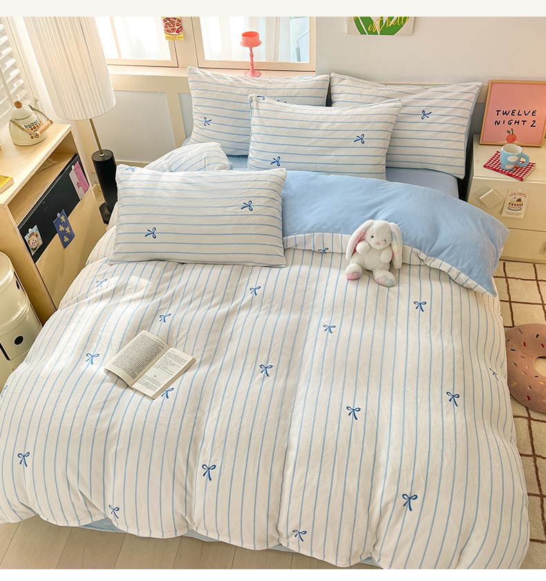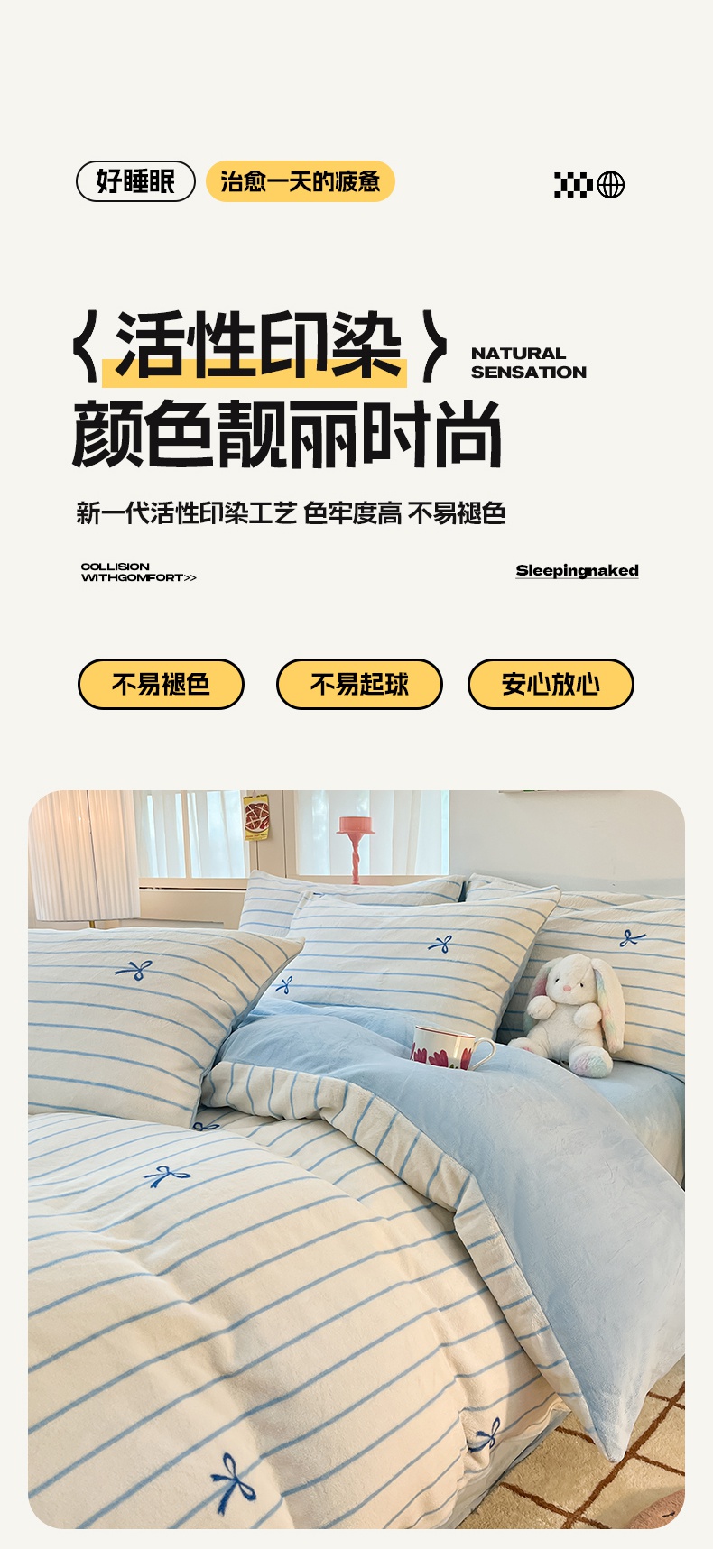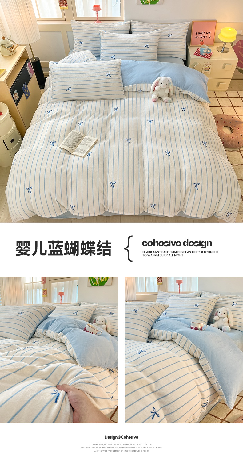 寐眠 2024新款高克重印花牛奶绒四件套条纹风格一 婴儿蓝蝴蝶结