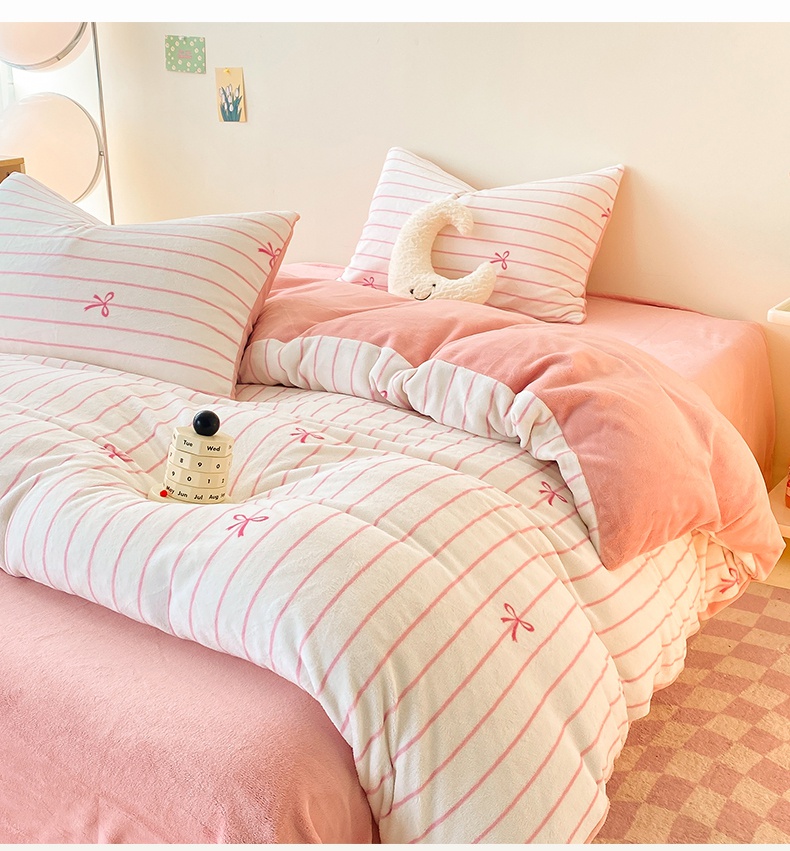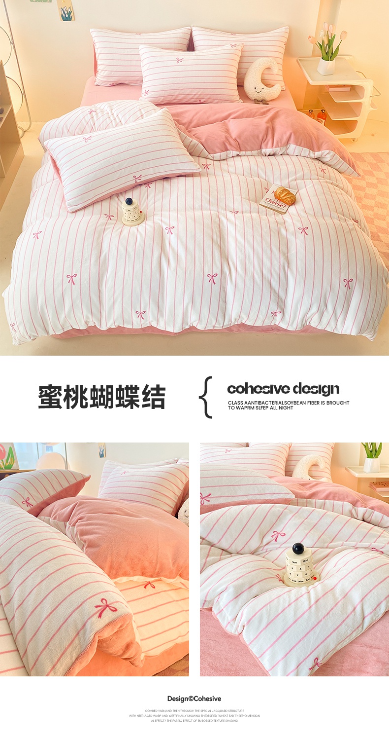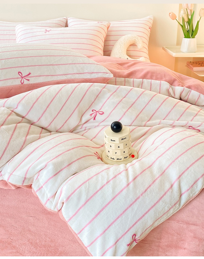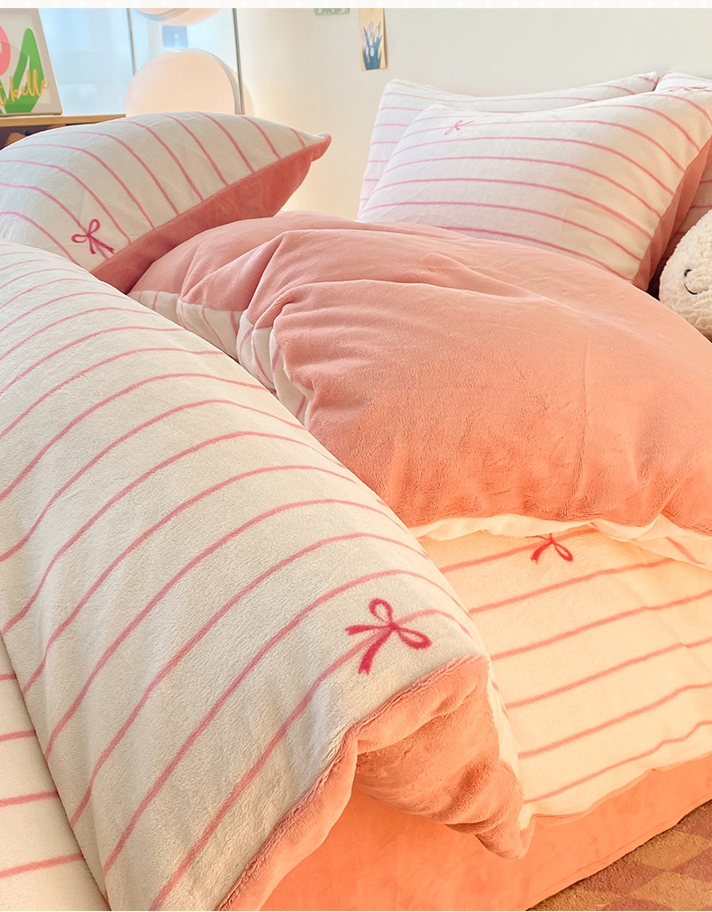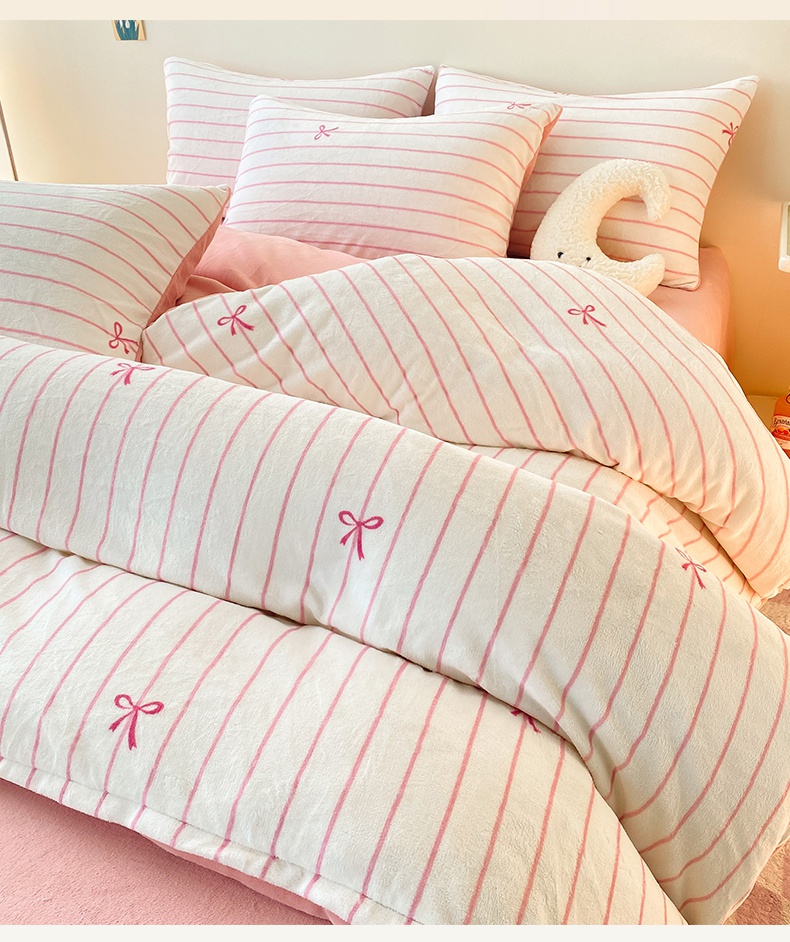 2024新款高克重印花牛奶绒四件套条纹风格二 蜜桃蝴蝶结