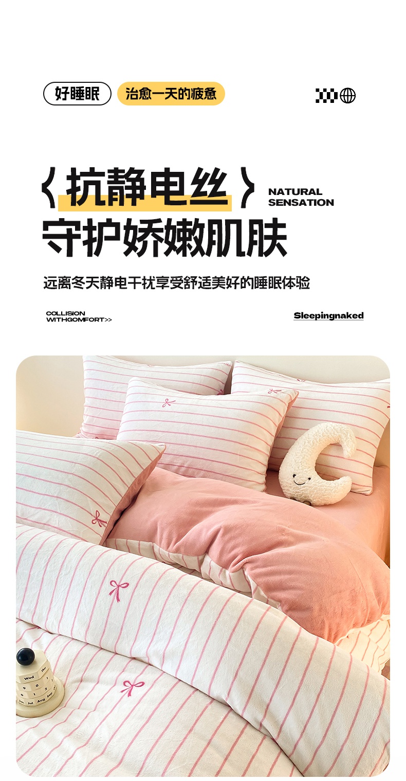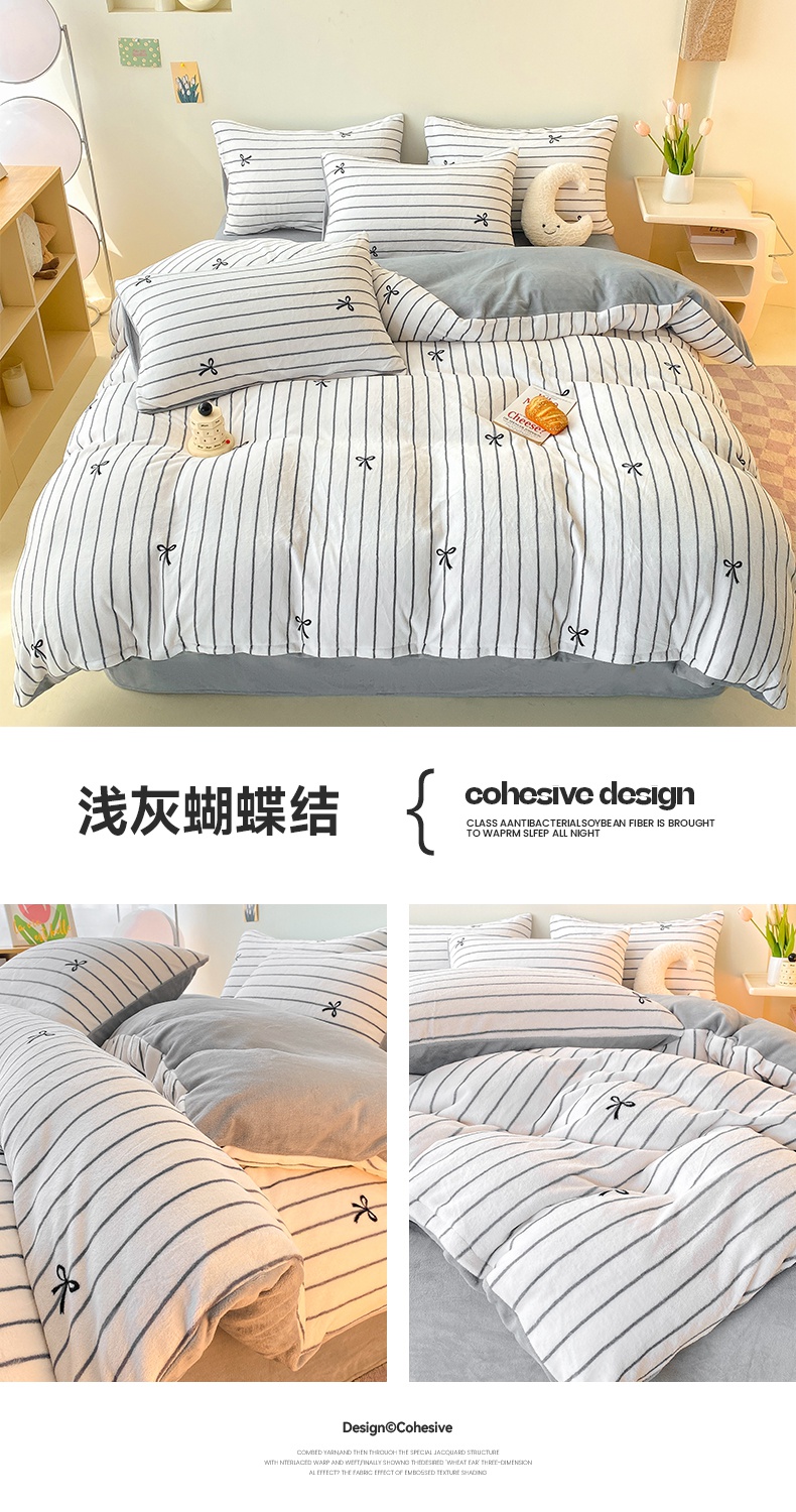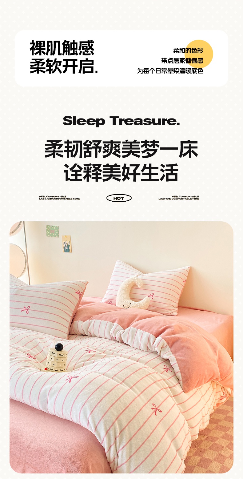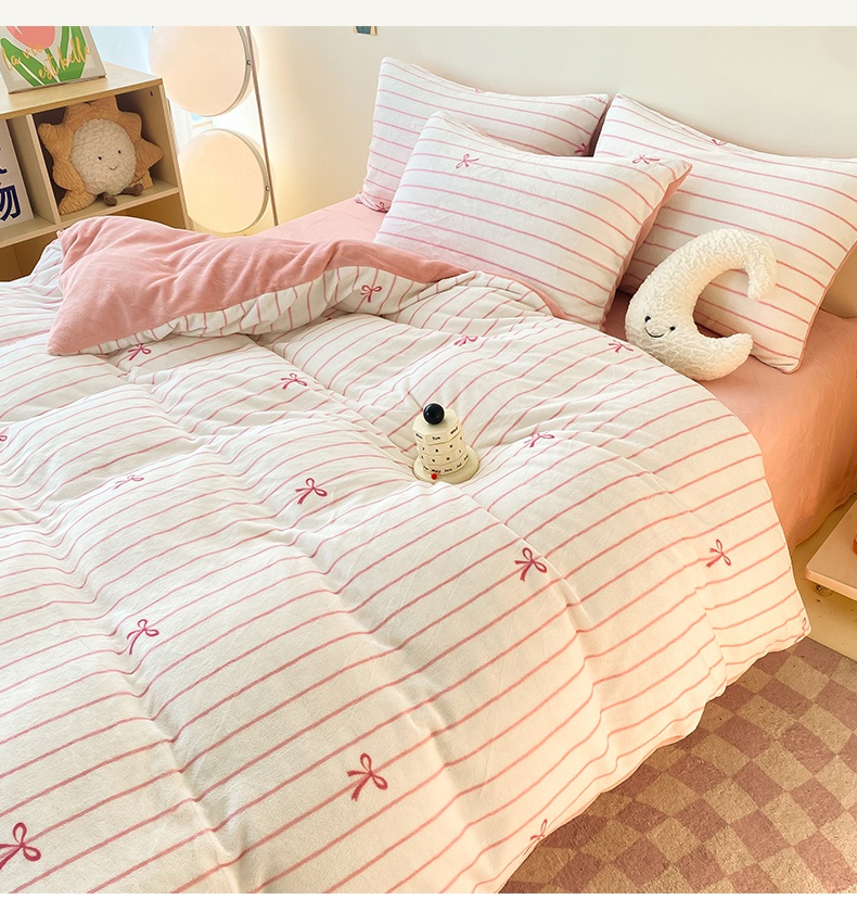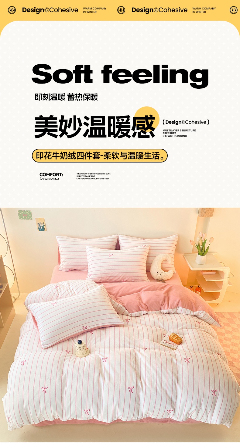 2024新款高克重印花牛奶绒四件套条纹风格二 蜜桃蝴蝶结