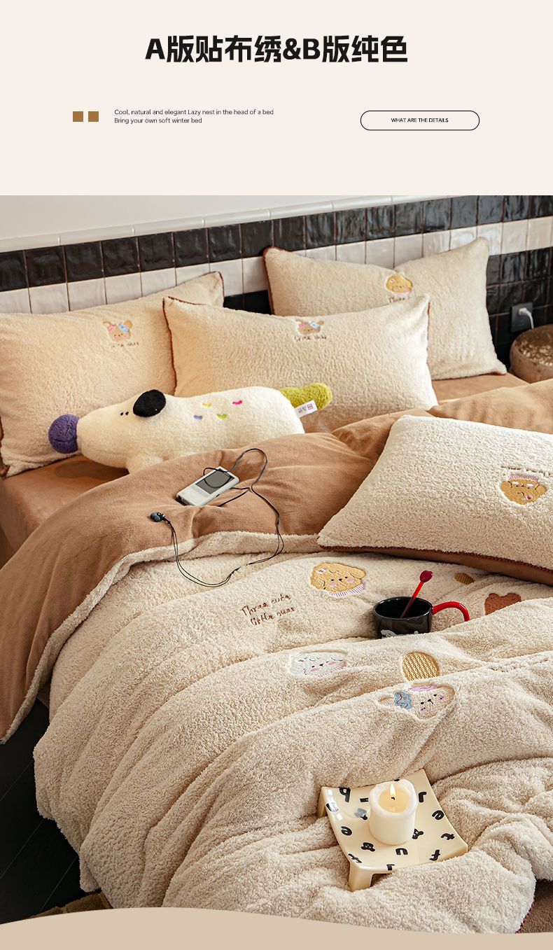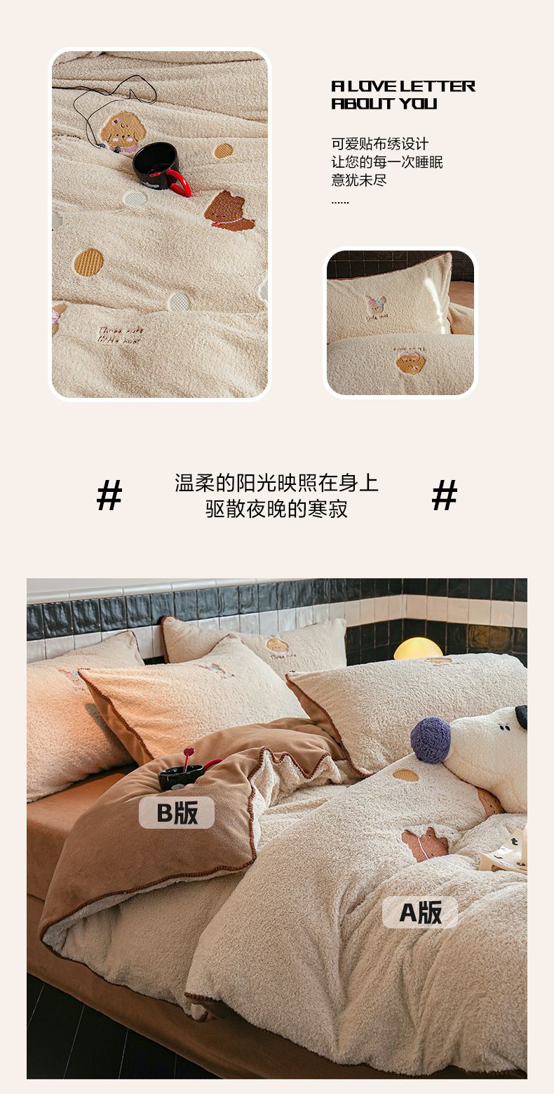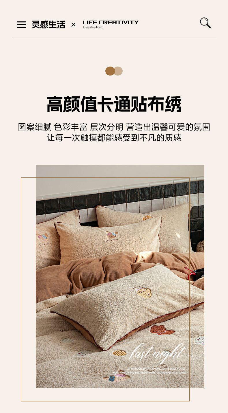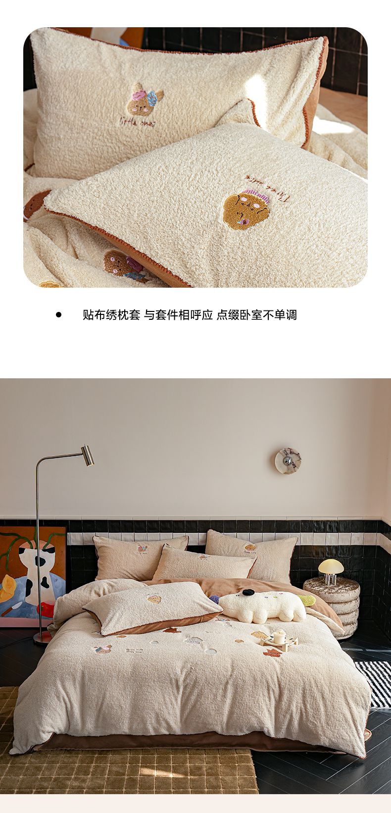 秀色家纺 2025新款卡通风可爱少女心绵羊绒牛奶绒四件套加厚保暖秋冬季法兰绒刺绣被套 懒鹅