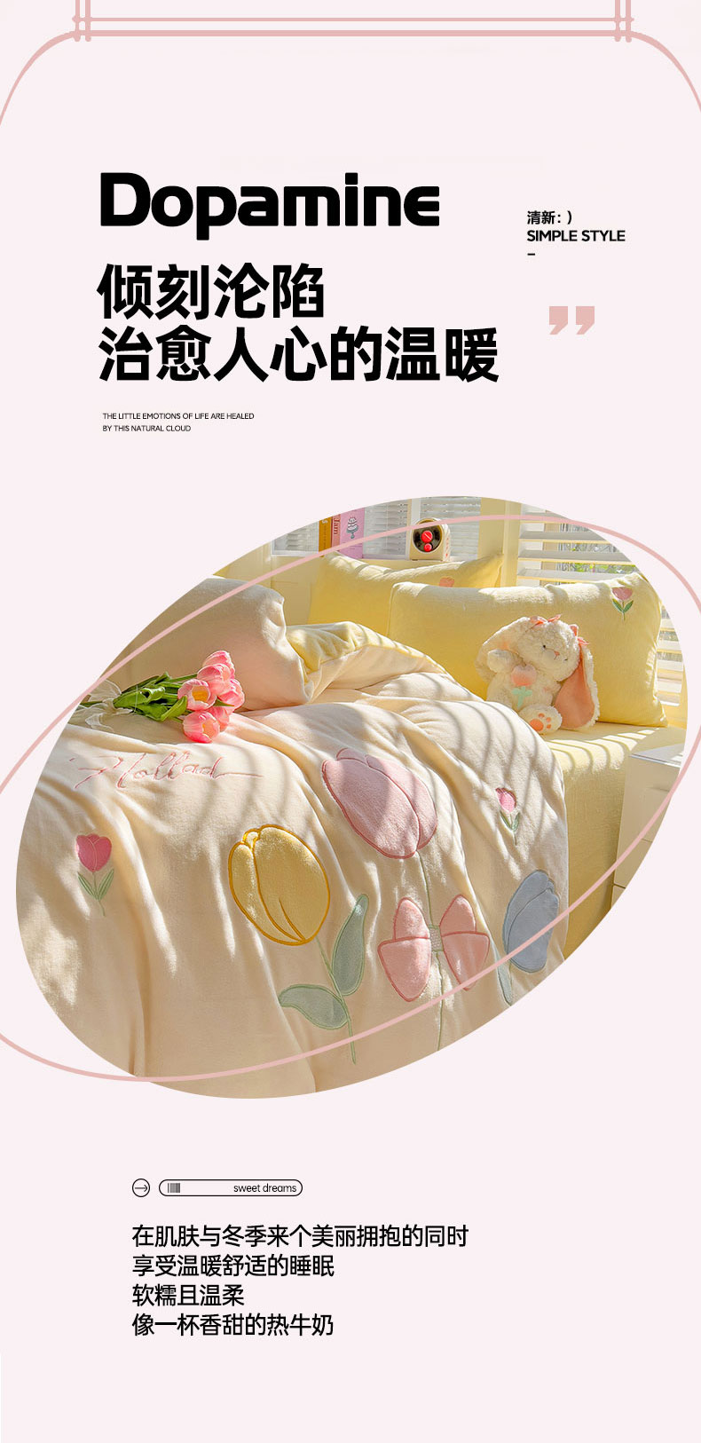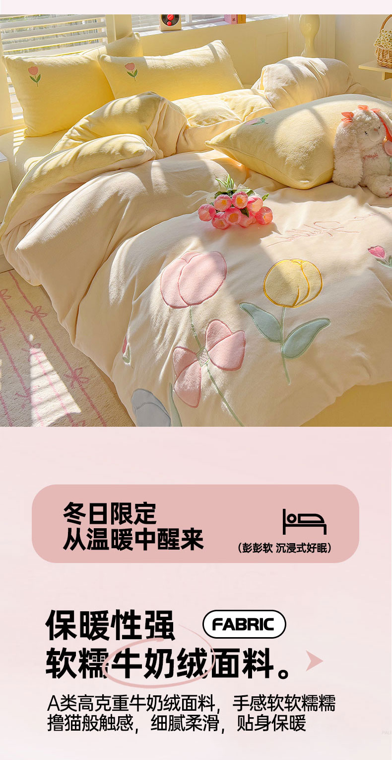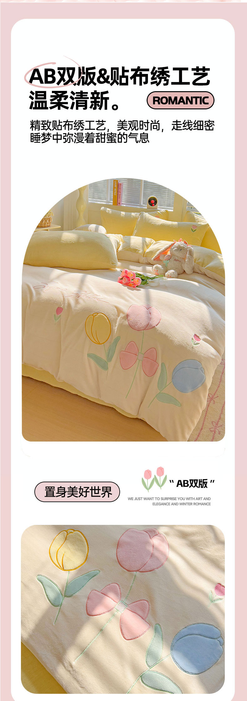 当前位置: 91家纺网 > 商品网购 > 床品套件 > 四件套 > 牛奶绒四件套 > 灰鲸 2025新款高克重牛奶绒大版郁金香花朵贴布绣四件套 贴布绣郁金香-奶昔白+奶油黄
