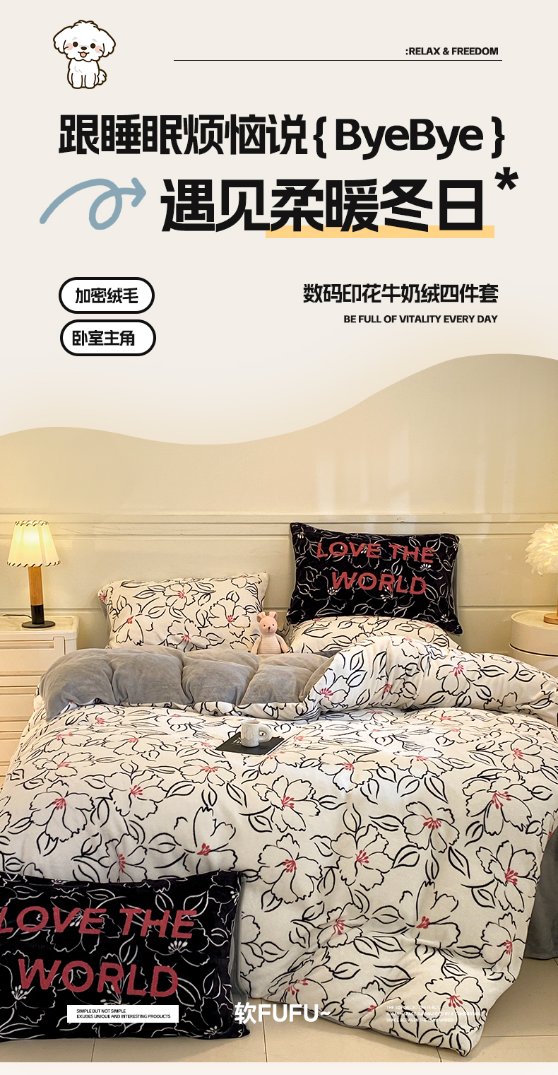 (总)如一 2025新款高克重大版数码印花牛奶绒四件套,毛毛狗,猫咪酱,俏皮狗,色彩猫,小熊仔,熊猫咖,游乐园,粉伙伴,拉兔咖,萌宠黄,萌宠绿,萌派对,围巾狗,线条狗,小粉喵,小花喵,小伙伴