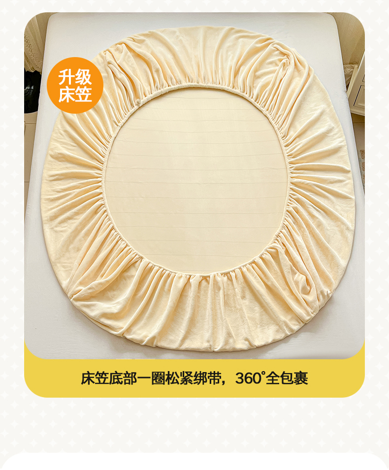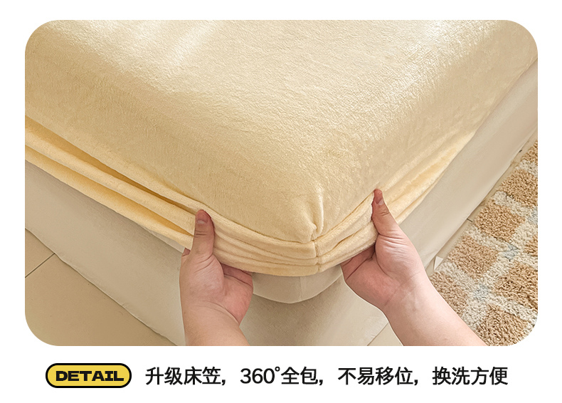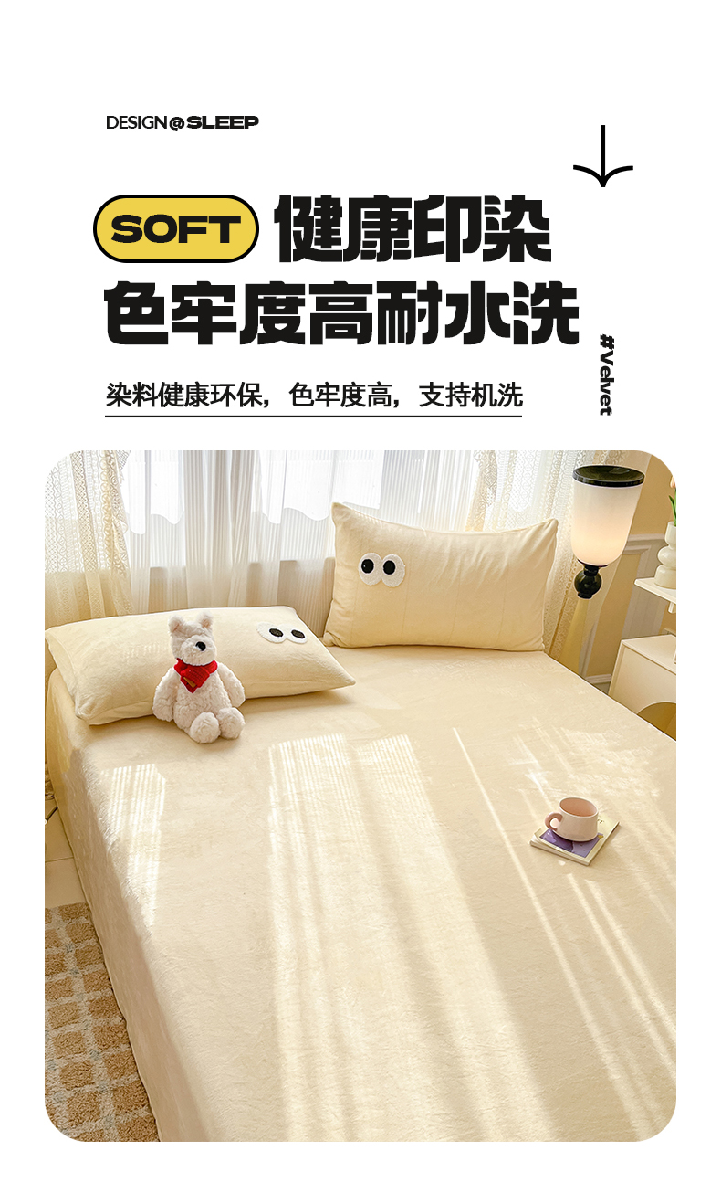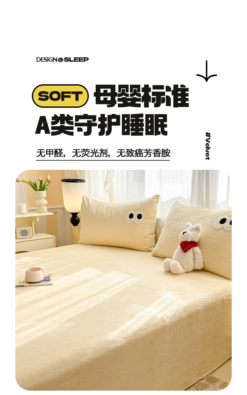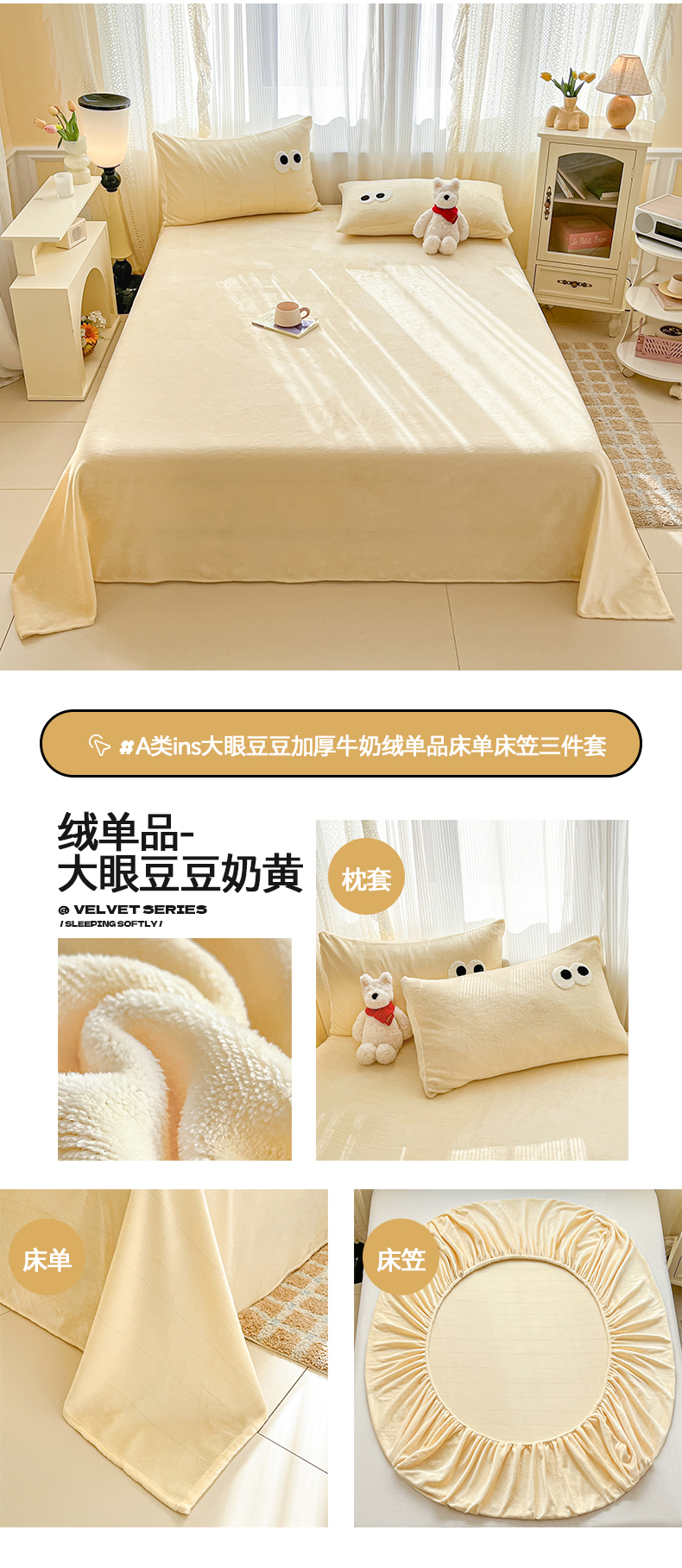 桃子家居 2025新款A类ins大眼豆豆加厚牛奶绒单品床单床笠三件套系列 绒单品-大眼豆豆奶黄床笠