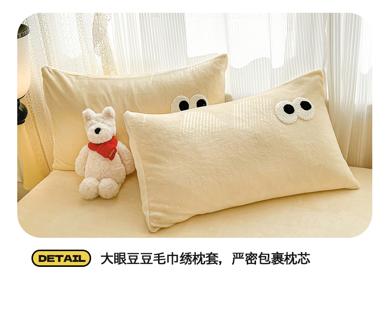 • 91家纺网 家纺一手货源 找家纺 桃子家居  2025新款A类ins大眼豆豆加厚牛奶绒单品床单床笠三件套系列 绒单品-大眼豆豆奶黄床笠