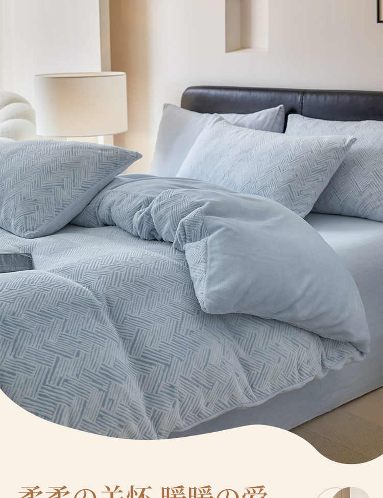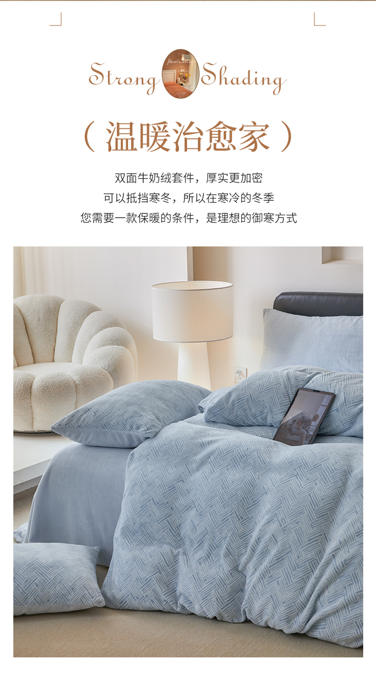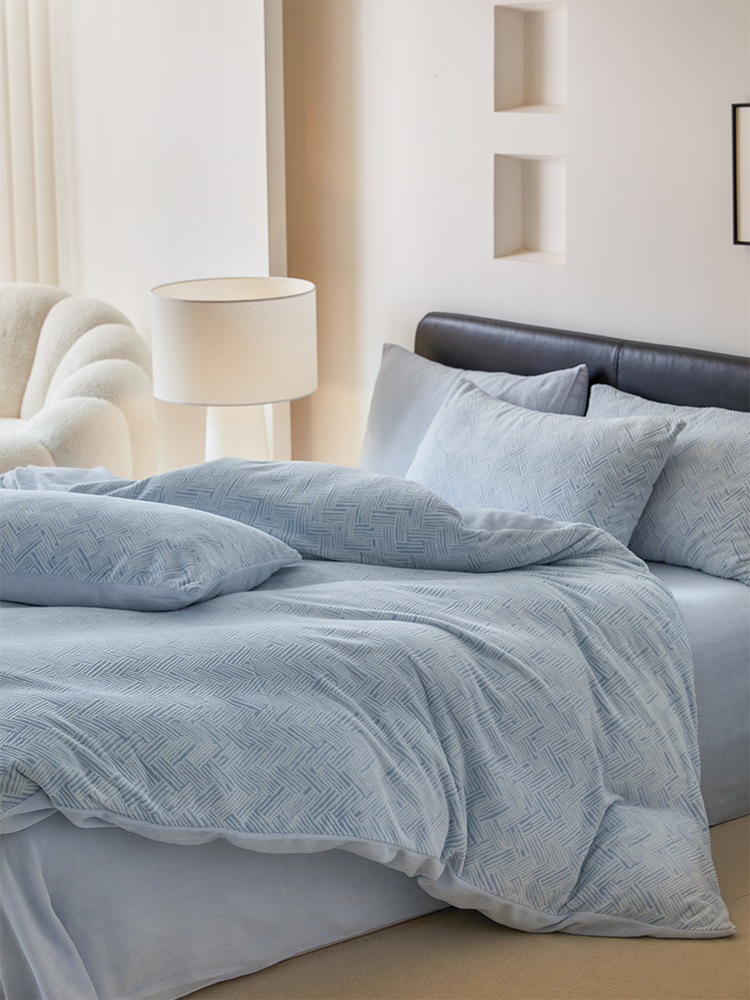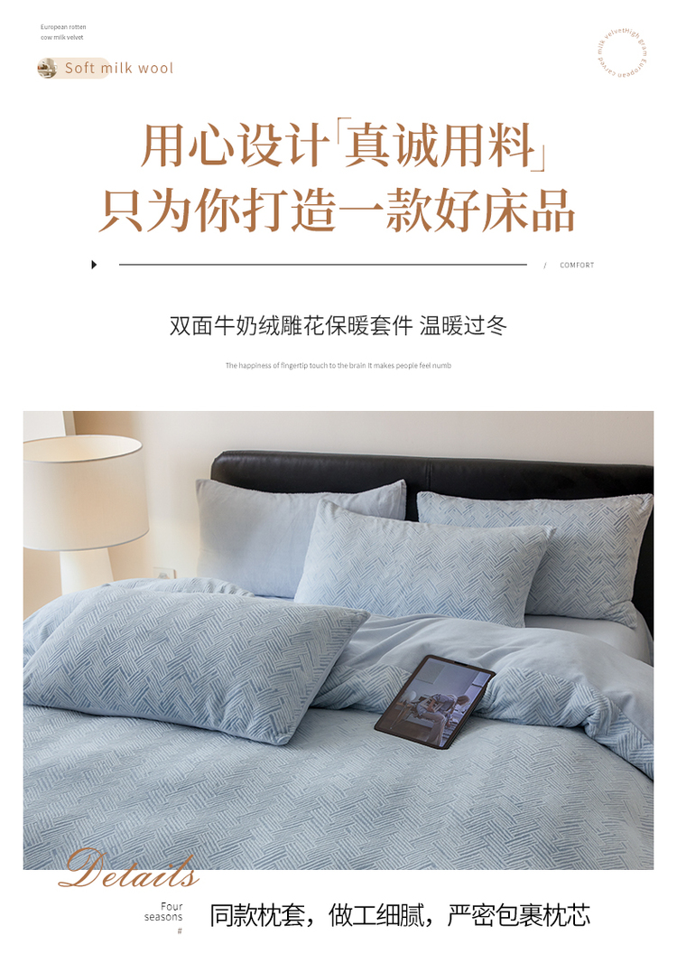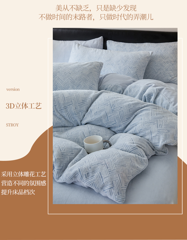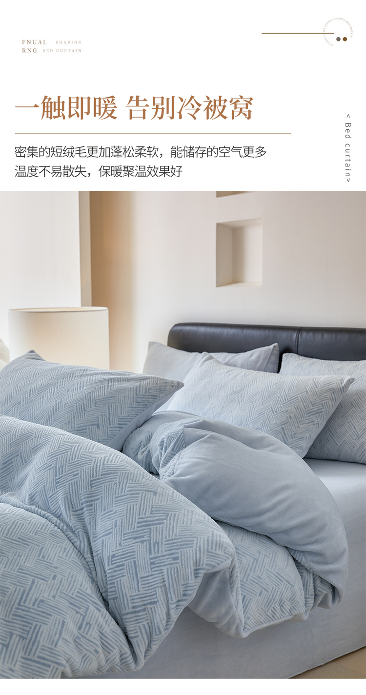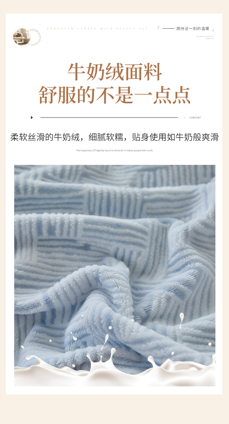 商品名称:(买家秀爆款不断货)A类母婴级牛奶雕花绒四件套珊瑚绒小香风牛奶绒四件套雪花绒四件套雕花牛奶绒四件套白 小几何-婴儿蓝