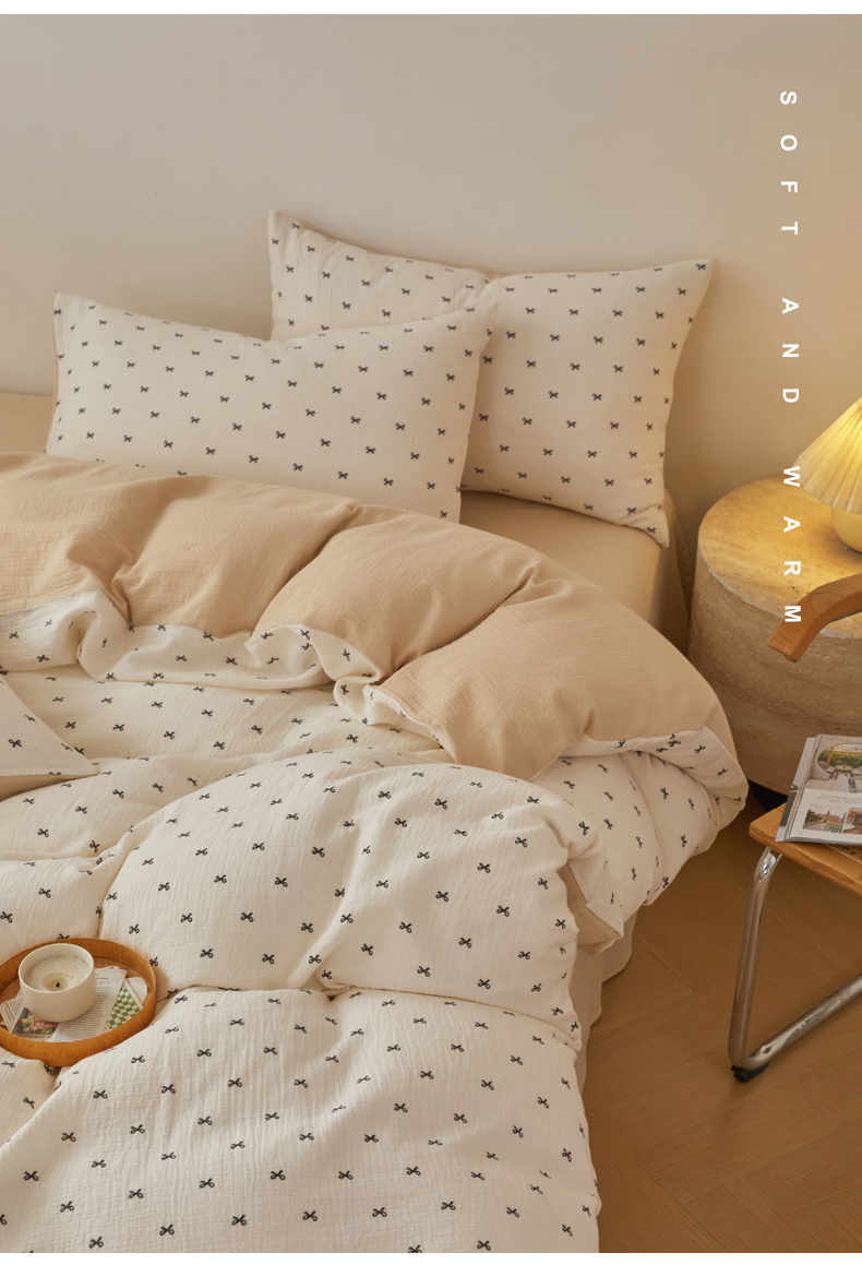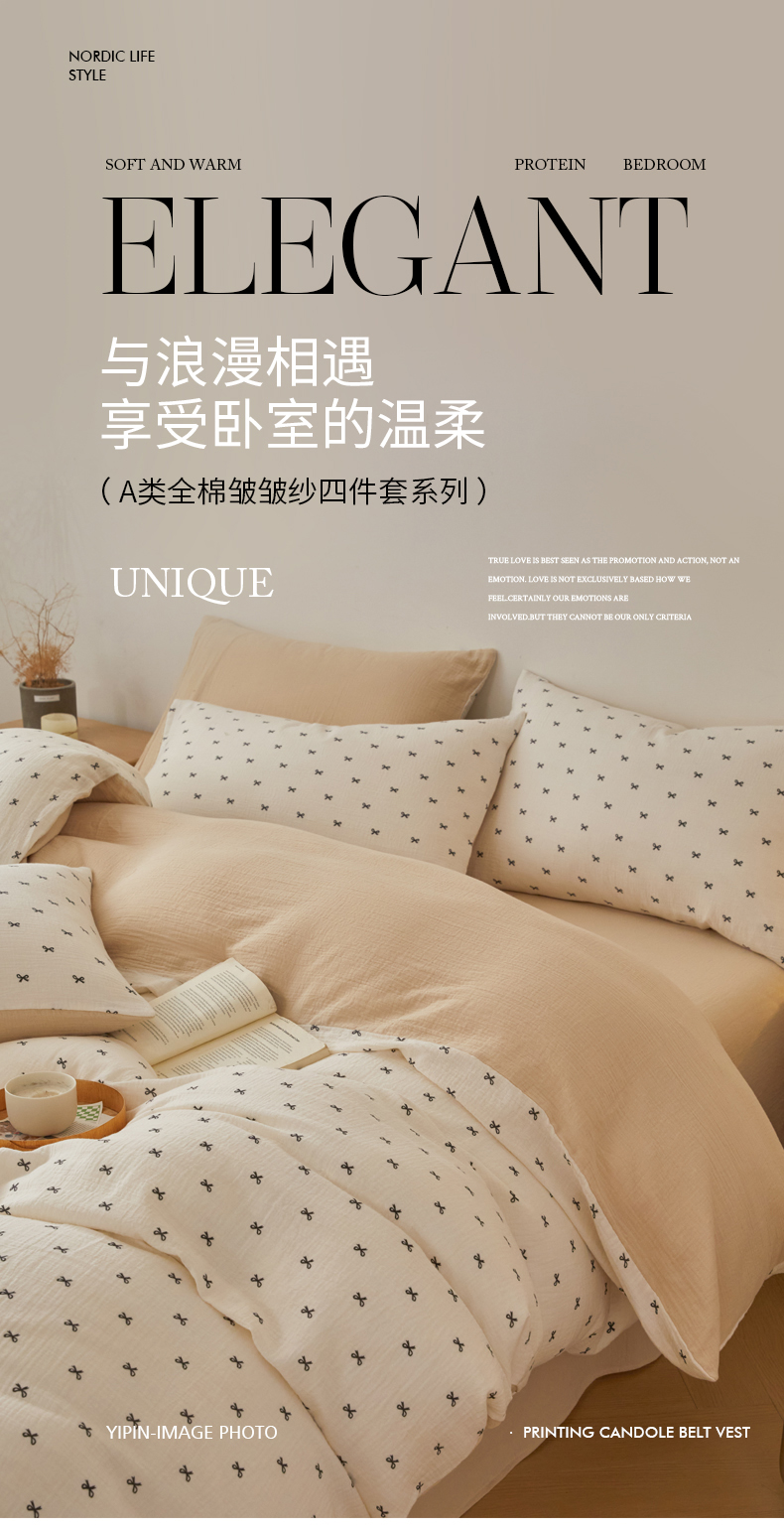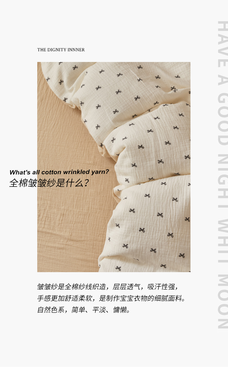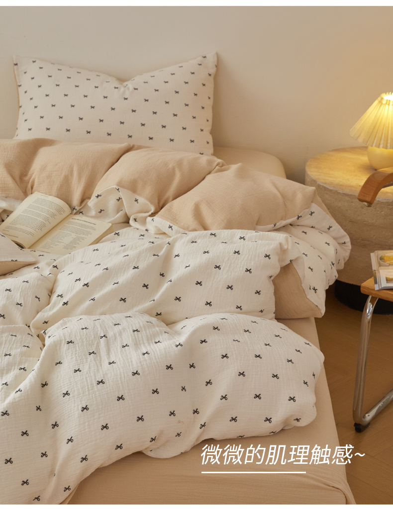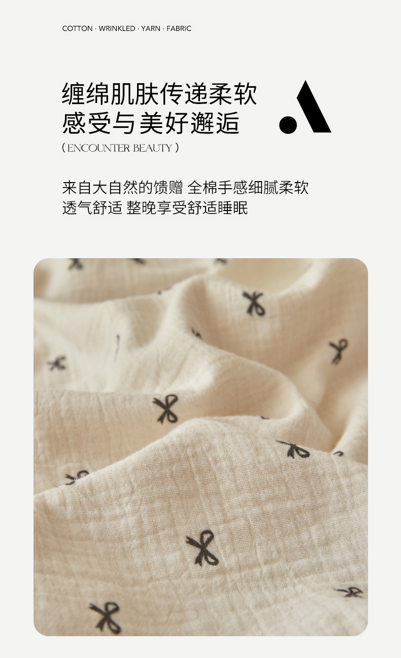 商品名称:618家纺 2025新款A类母婴级全棉三层纱皱皱纱纯棉四件套 蝴蝶结米