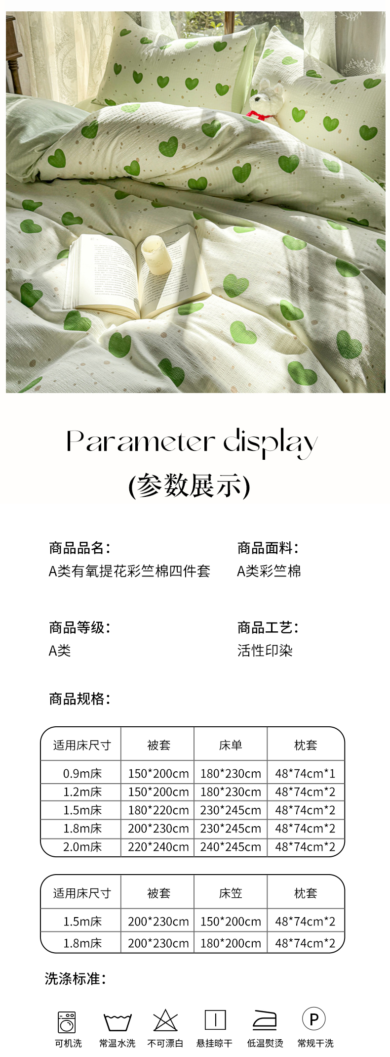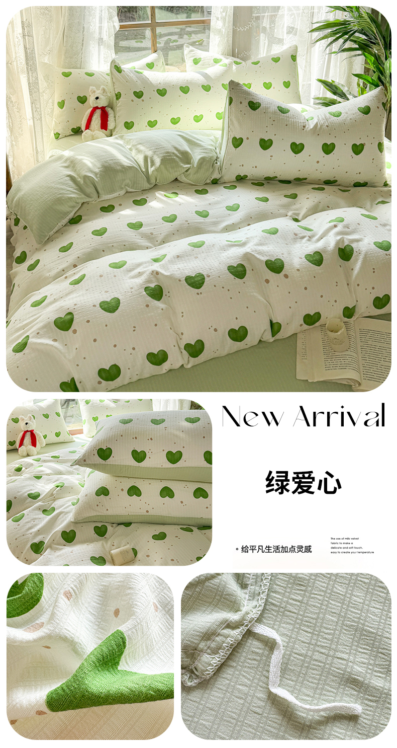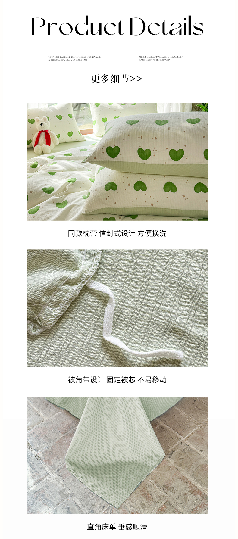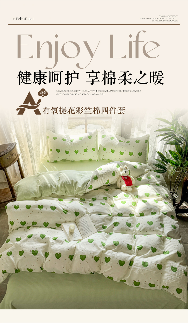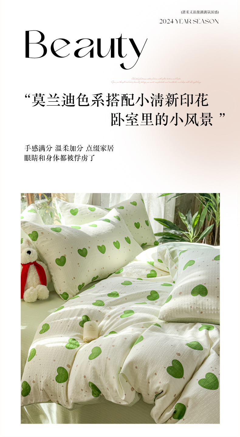 当前位置: 91家纺网 > 商品网购 > 床品套件 > 四件套 > 其它四件套 > 晚爱家纺(原晚安家居) 2025新款A类双层纱有氧提花彩竺棉小竺棉四件套 绿爱心