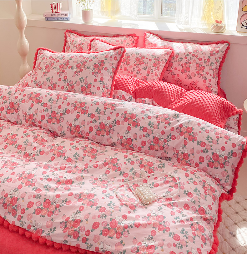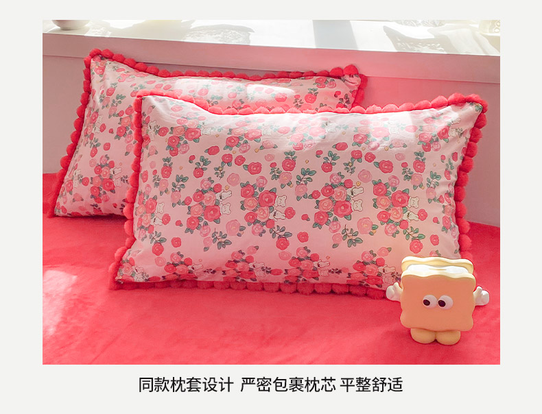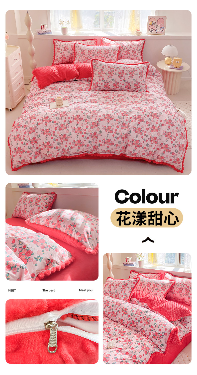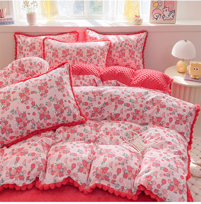 千朵 2025新款棉加豆豆绒毛毛球边四件套 花漾甜心