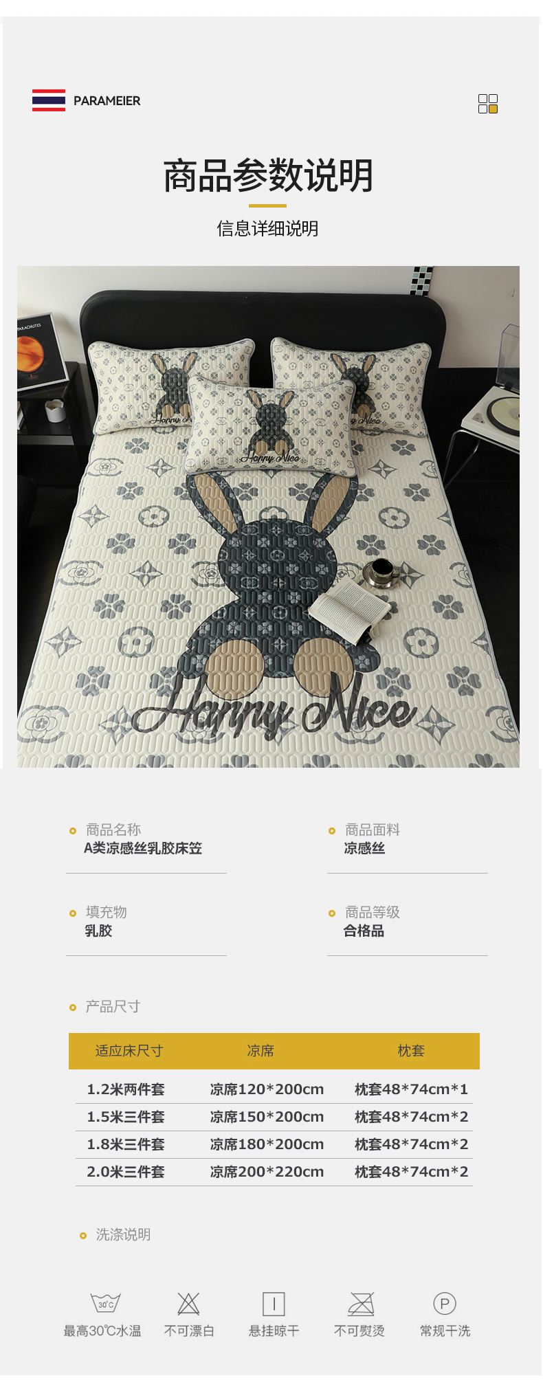 商品名称:圣比熊 2025新款大版印花纯色0.5乳胶凉席床笠款床裙款凉席三件套 床单款-潮流熊