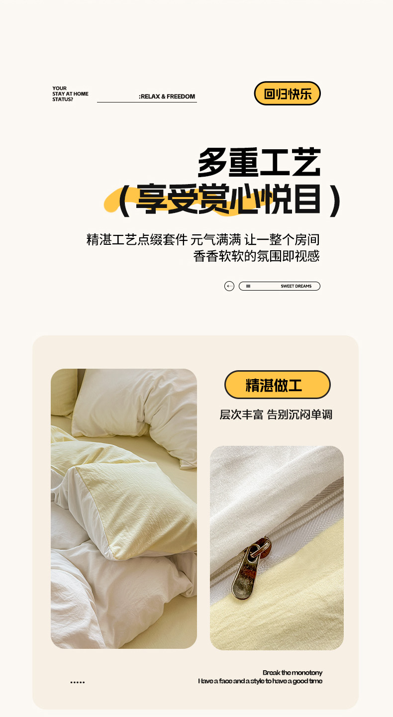 当前位置: 91家纺网 > 商品网购 > 床品套件 > 四件套 > 水洗棉四件套 > 冕悠家纺 2025新款A类105克超柔褶皱水洗棉拼色四件套 奶昔白+芝士黄