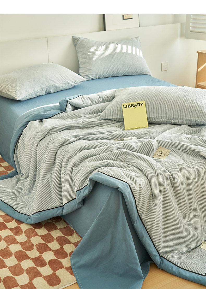 • 91家纺网 家纺一手货源 找家纺 寐绸家纺 2025新款纯棉水洗棉细条宽边大豆纤维夏被四件套 密条-浅粉