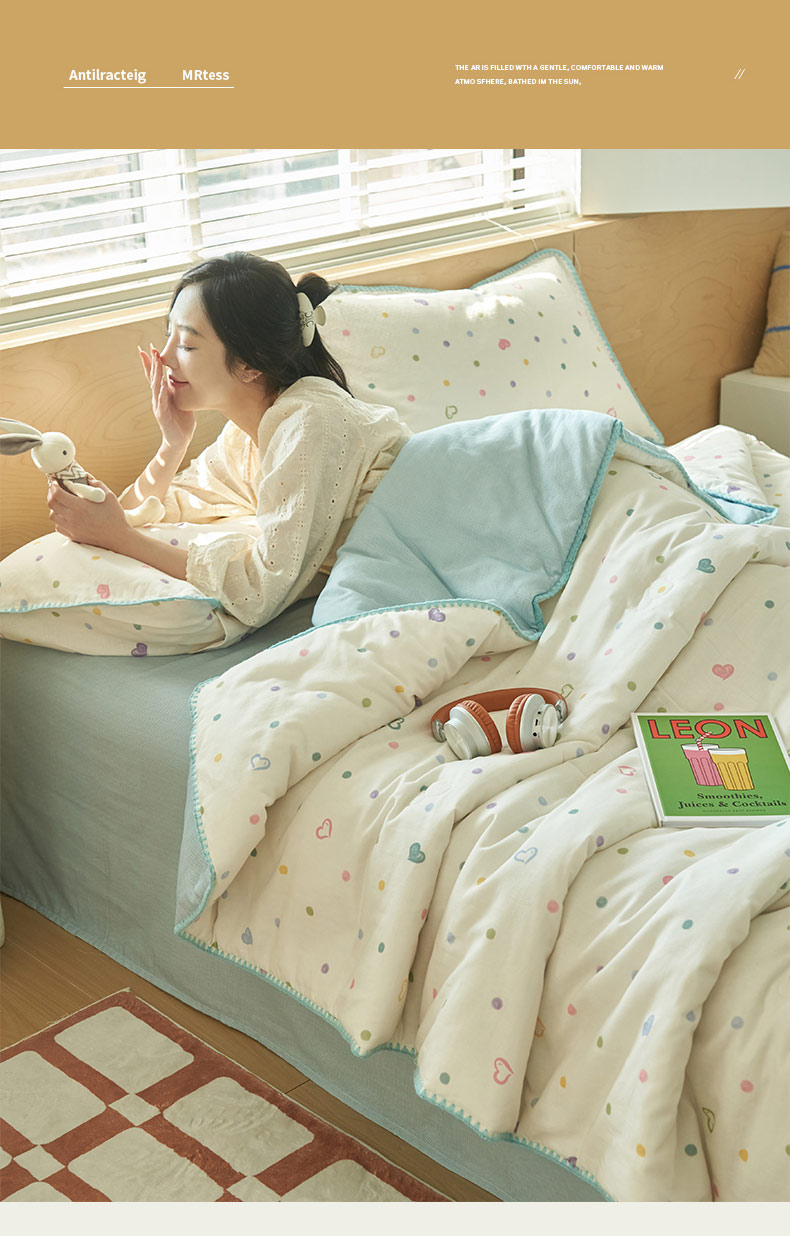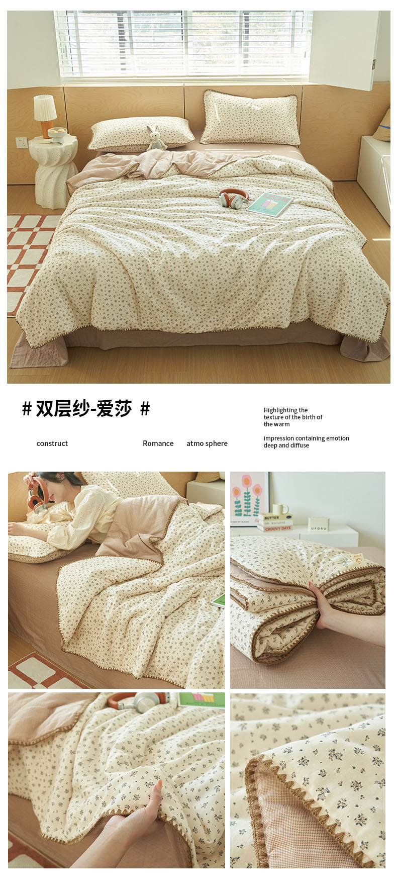 • 91家纺网 家纺一手货源 找家纺 寐绸家纺 2025新款纯棉双层纱印花大豆纤维夏被四件套 双层纱-花间