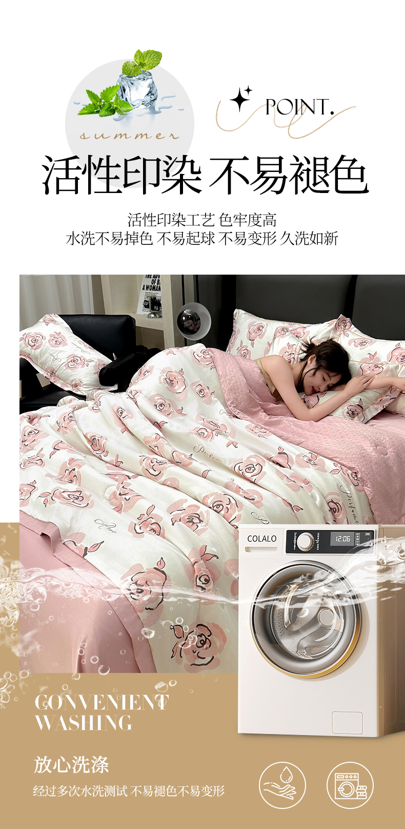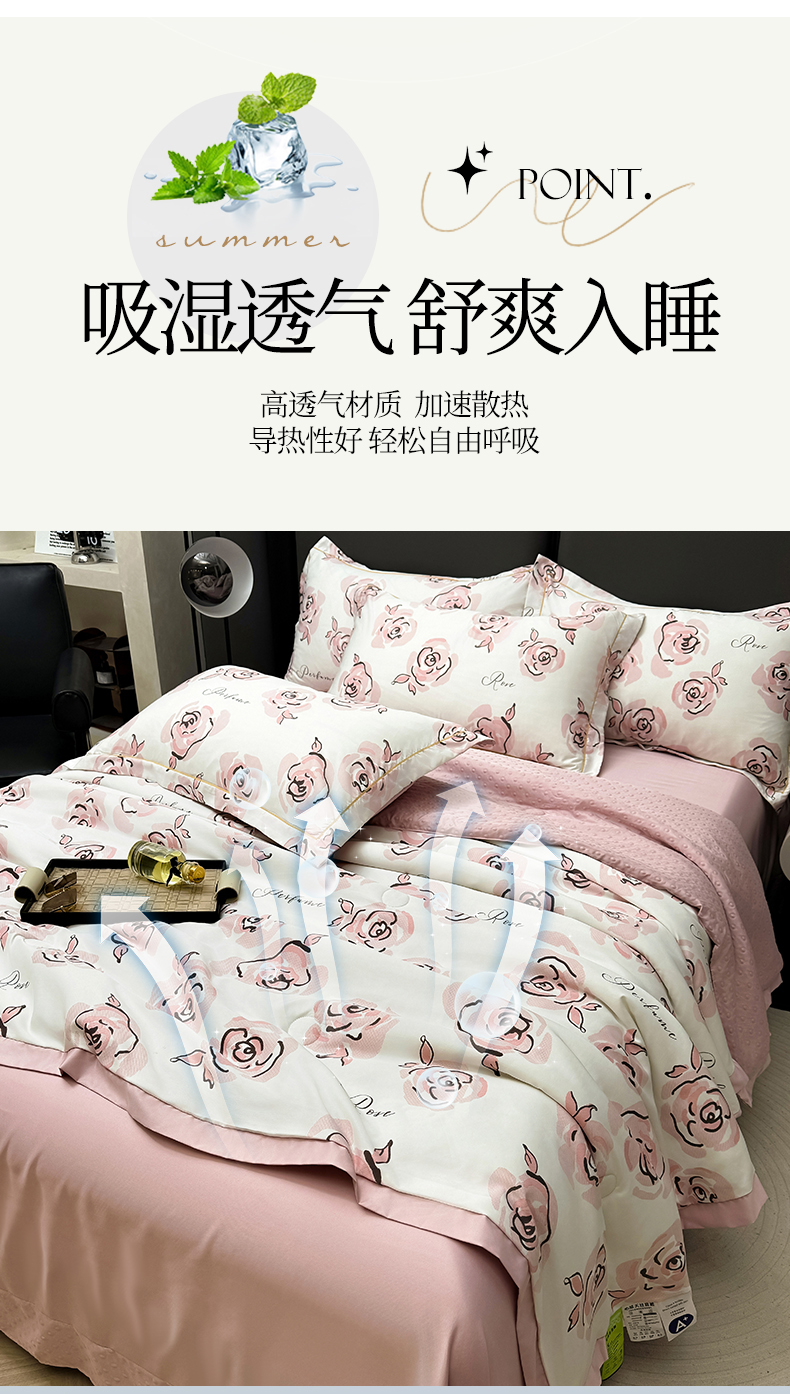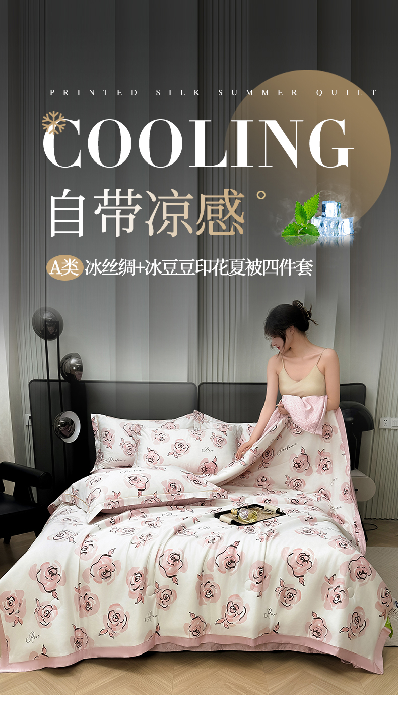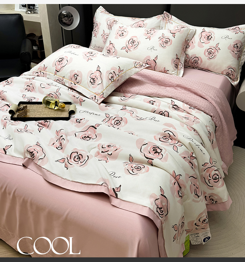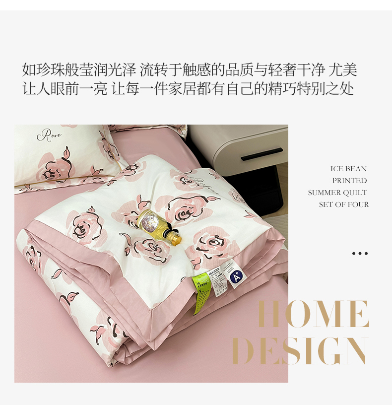 当前位置: 91家纺网 > 商品网购 > 床品套件 > 四件套 > 夏被四件套 > 满羽家纺 2025热款冰丝绸冰豆豆被夏被四件套凉感空调被(踩棉工艺)(吊边床单)-印花 浅忆浅粉