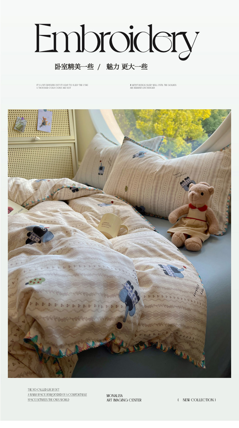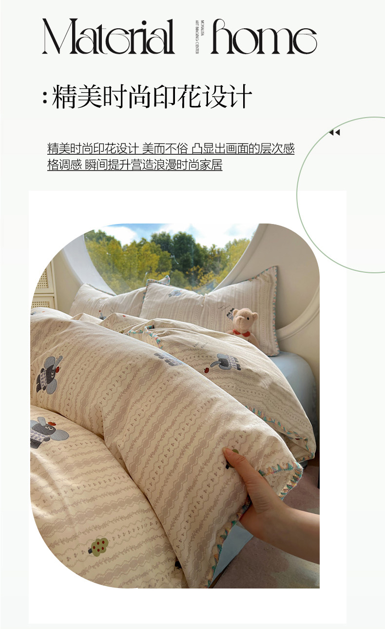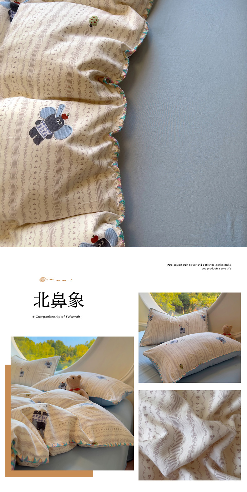 商品名称:葡萄家 2025爆款高克重彩色三角针A类针织双层纱四件套 提供买家秀 北鼻象