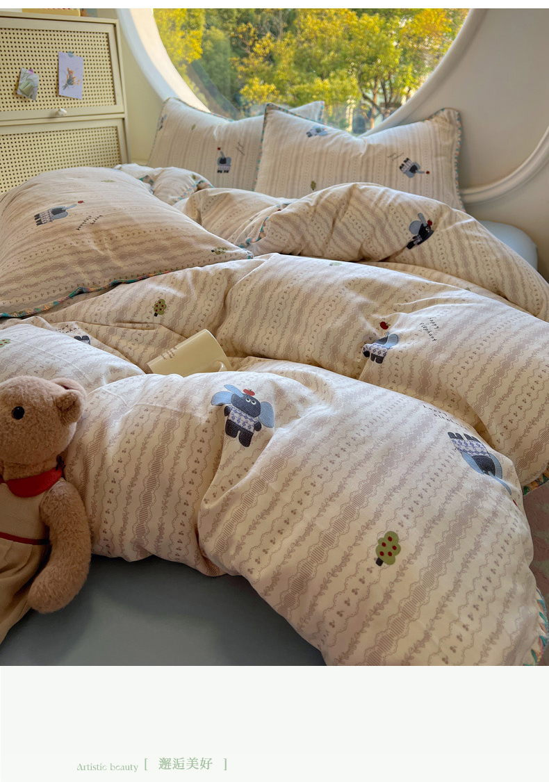 (总)2025新款专版高克重超萌卡通格子双拼毛巾绣软糯糯水洗棉四件套(场景二),狮子饼干,冰淇淋kt,蝴蝶结羊驼,腊肠狗狗,森林派对,糖果卡皮巴拉,星星兔