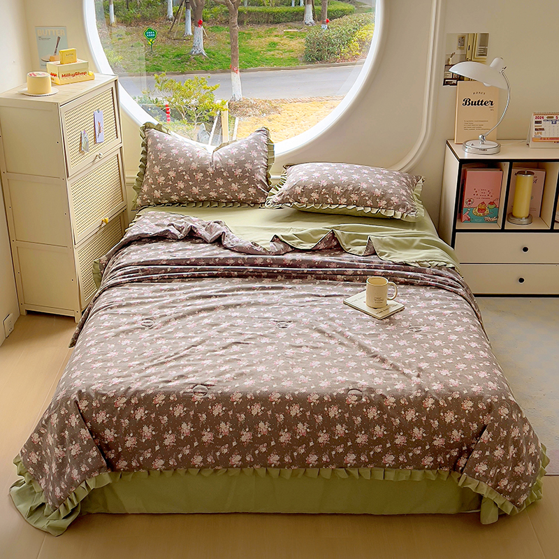 (总)欧尚 2025新款牛奶绒花边床盖四件套,粉点点,花小玉,咖色小心心,蓝点点,慕然,仙女粉,仙女紫