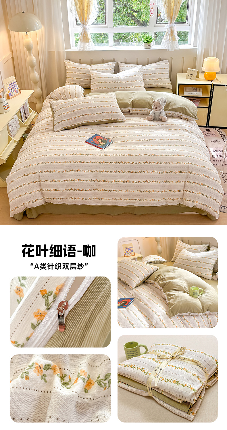当前位置: 91家纺网 > 商品网购 > 床品套件 > 四件套 > 其它四件套 > 玖明2025新款A类加厚柔软针织棉双层纱四件套 花叶细语-咖
