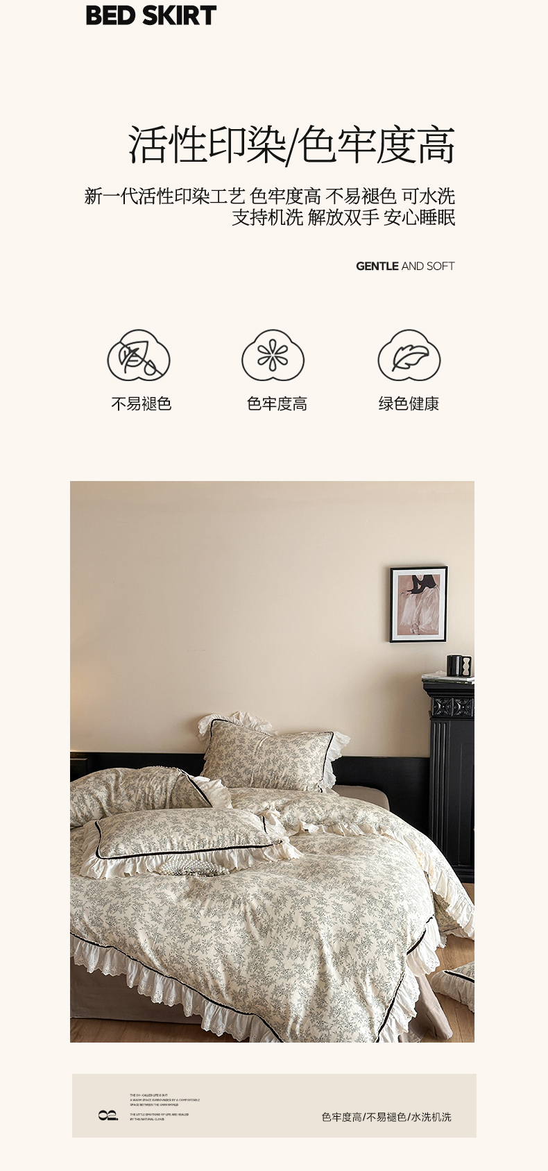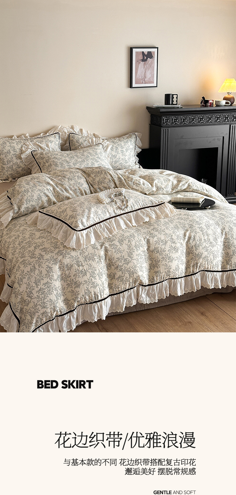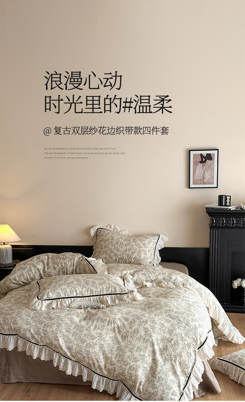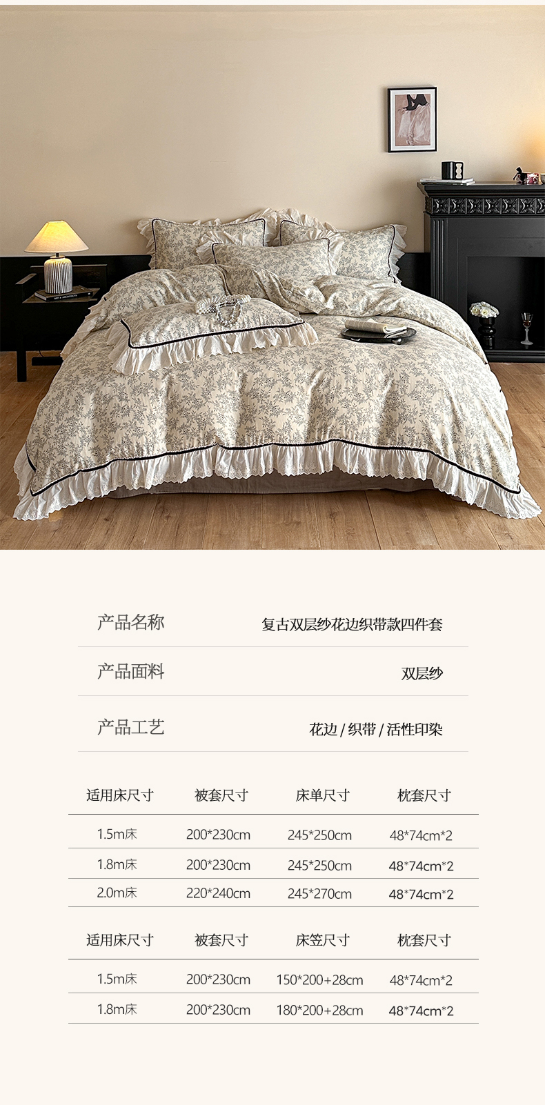 商品名称:蓝邻家纺 2025春夏新款全棉纯棉复古双层纱花边织带款四件套 瑞莎-深灰