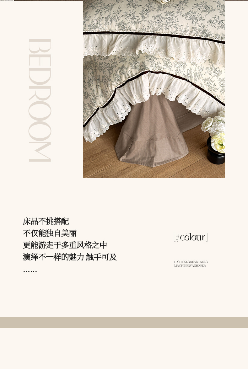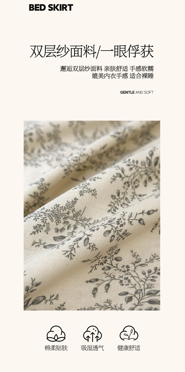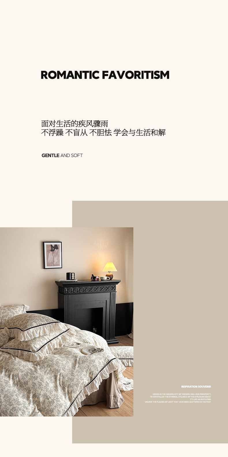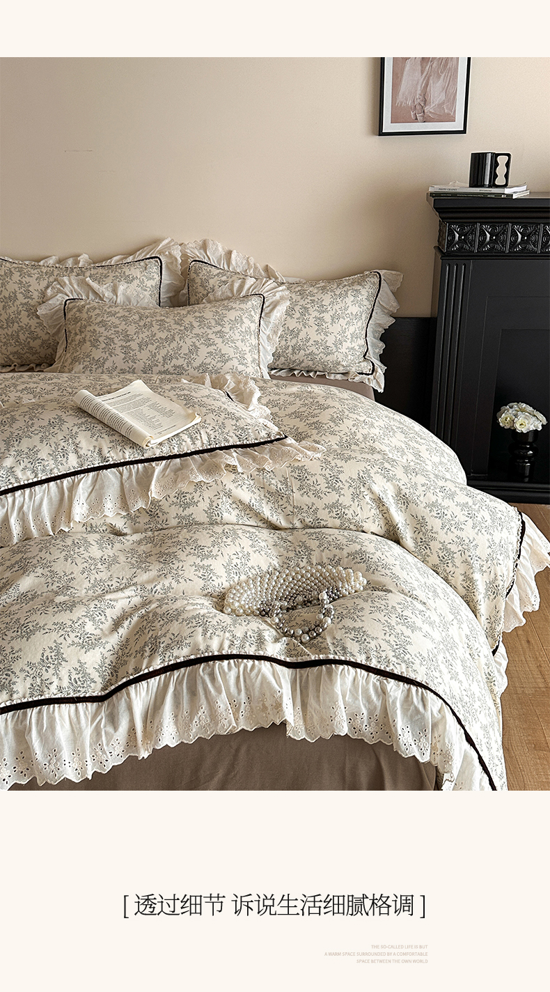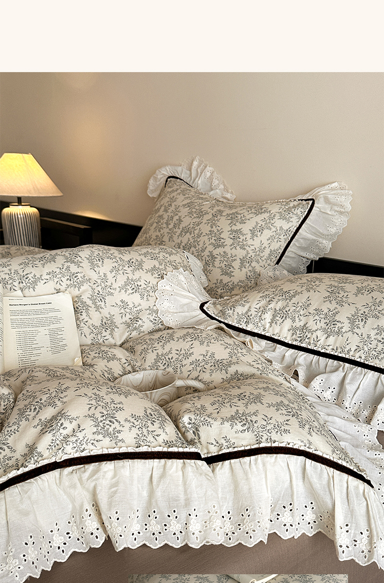 商品名称:蓝邻家纺 2025春夏新款全棉纯棉复古双层纱花边织带款四件套 瑞莎-深灰
