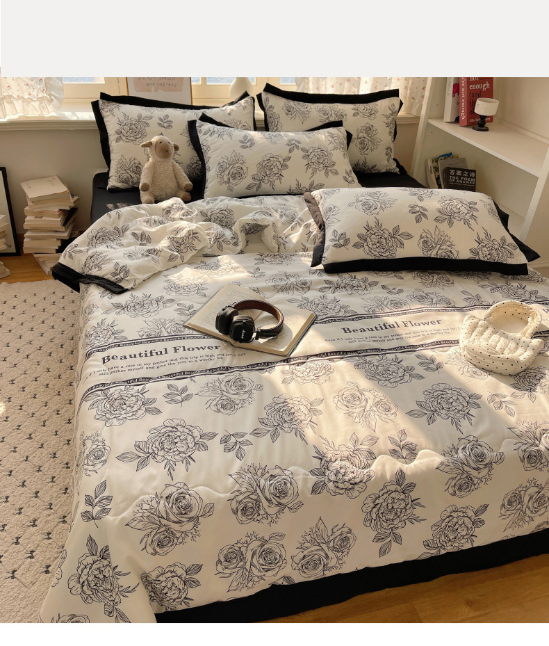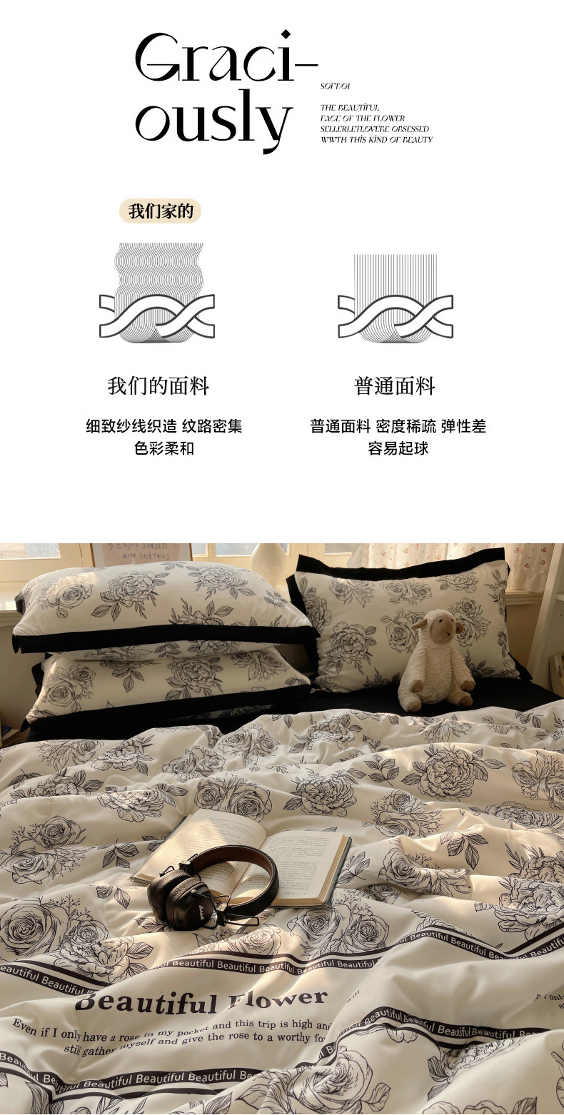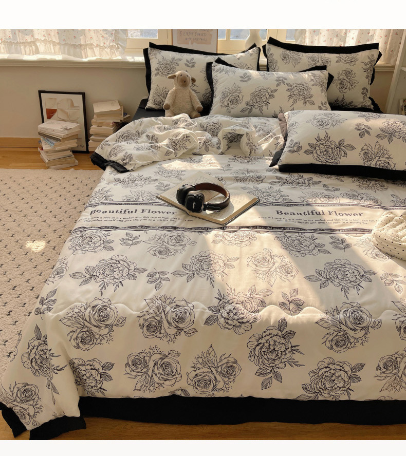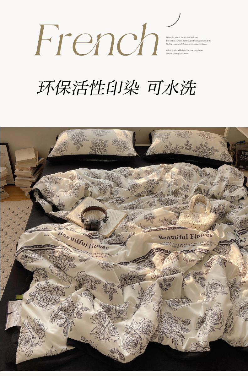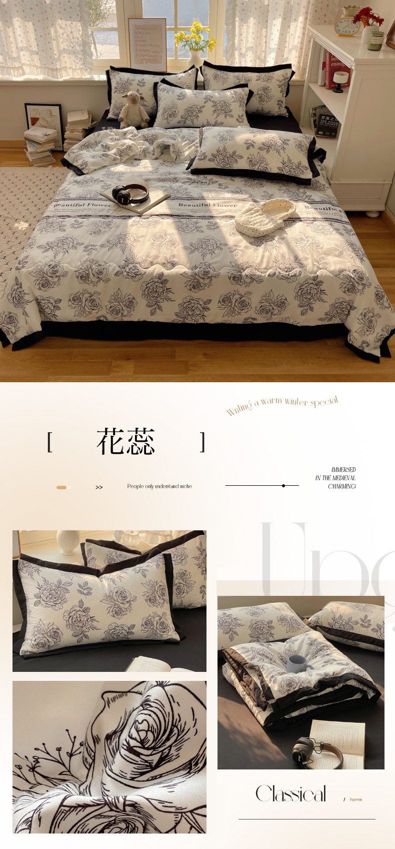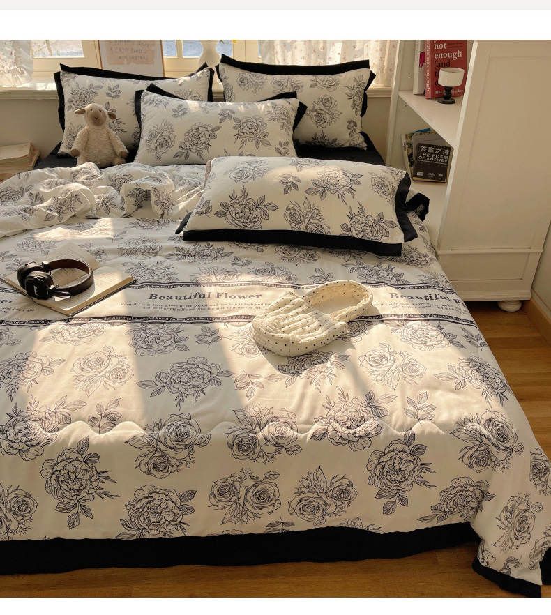 当前位置: 91家纺网 > 商品网购 > 床品套件 > 四件套 > 夏被四件套 > 花伞家居 2025新款赫本高级感黑白系列花边夏被四件套 夏被-花蕊