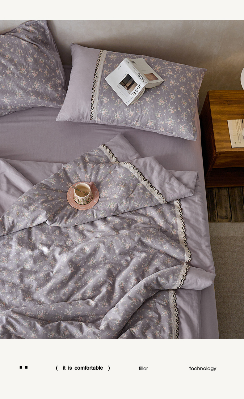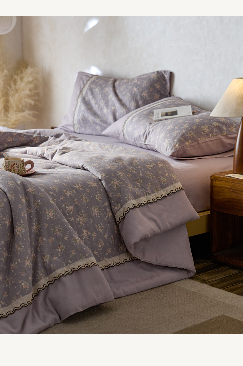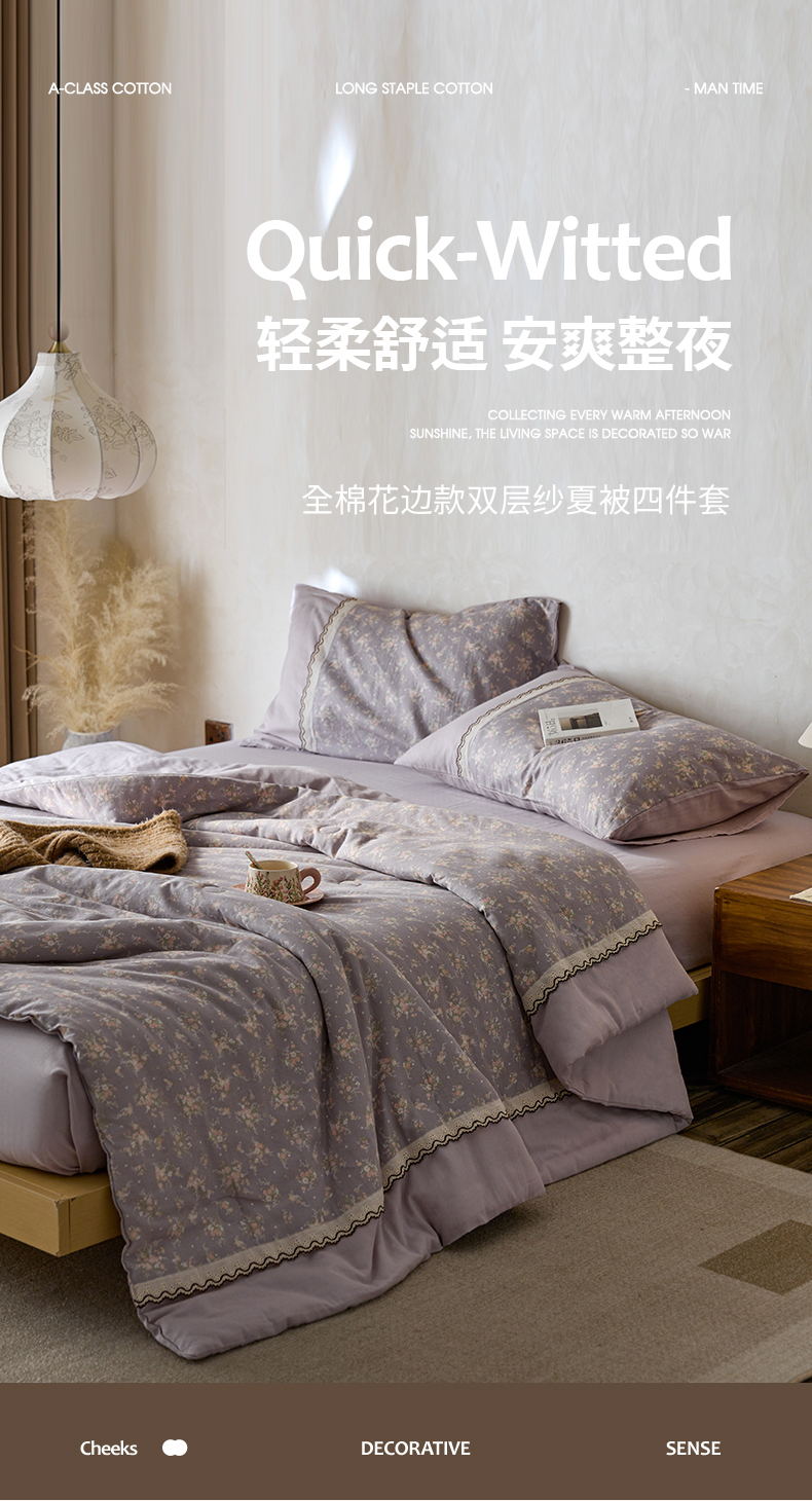 安莱生活 2025新款全棉纯棉双层纱复古花边款夏被夏凉被空调被四件套 紫茉
