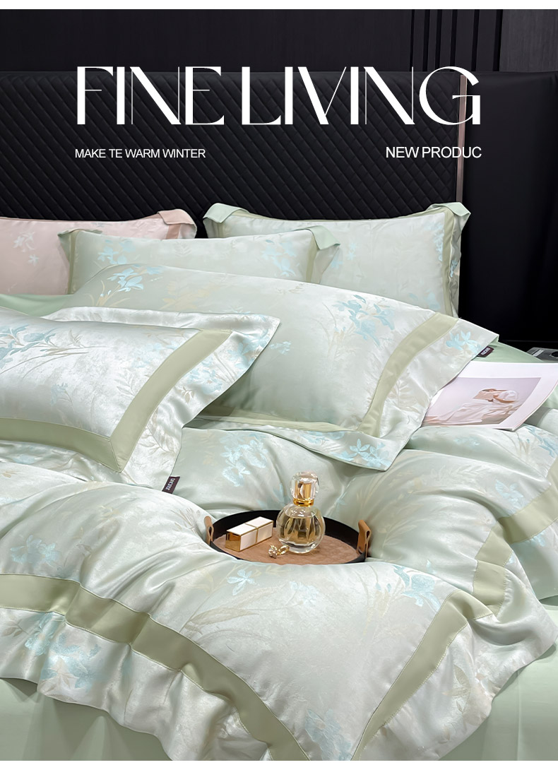 商品名称: 2025夏季A类天丝棉贡缎提花四件套真丝全工艺丝滑裸睡长绒棉床单床笠轻奢风爆款床上用品 尤朵-绯绿
