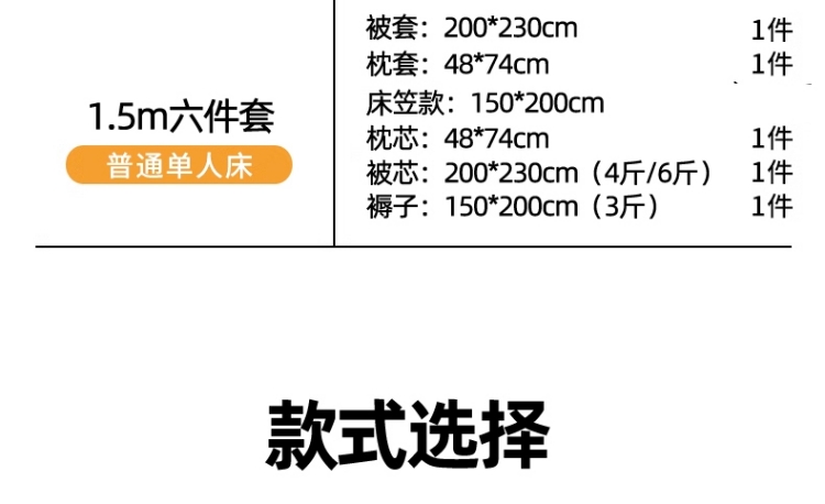 1.0米床笠款-六件套(6斤被芯) | ¥224.00 |