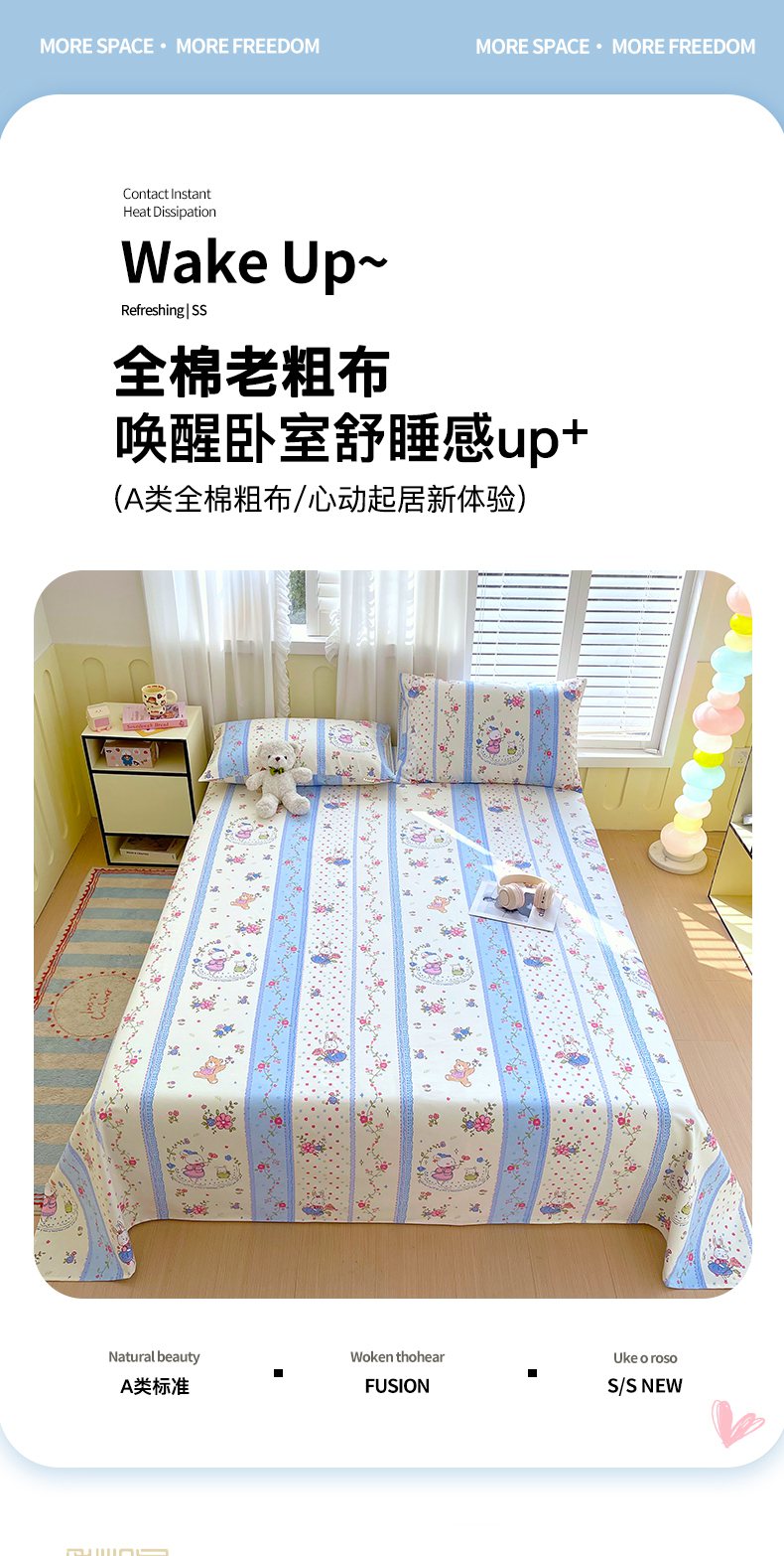 金鑫汇家纺 2025年新款百分百全棉老粗布全棉加厚加密高克重单品床单(花型更好卖,面料更厚实,自带凉感) 老粗布快乐萌兔蓝