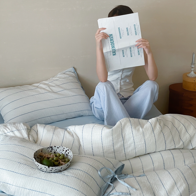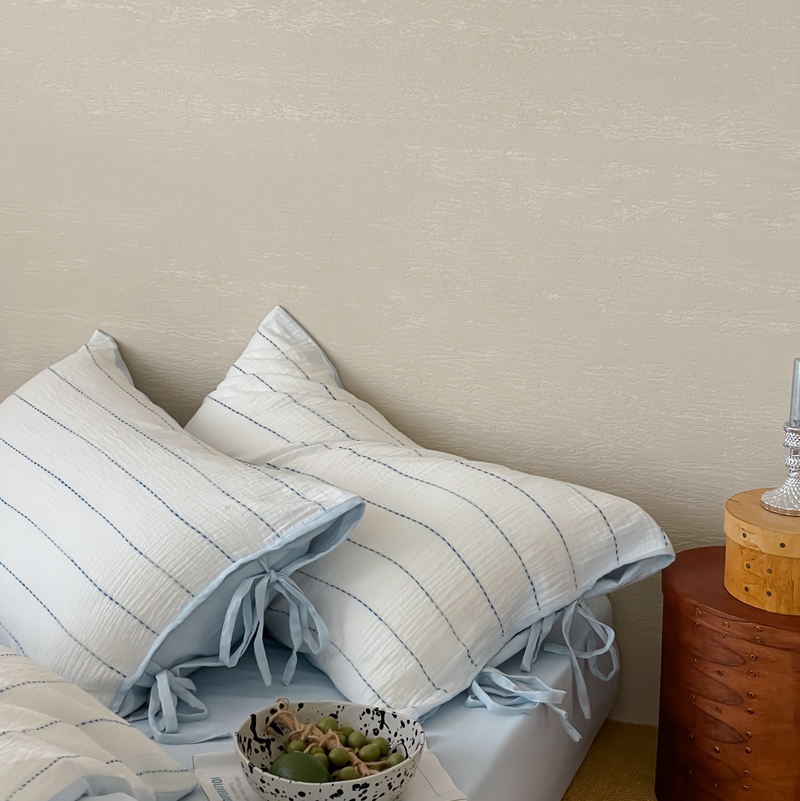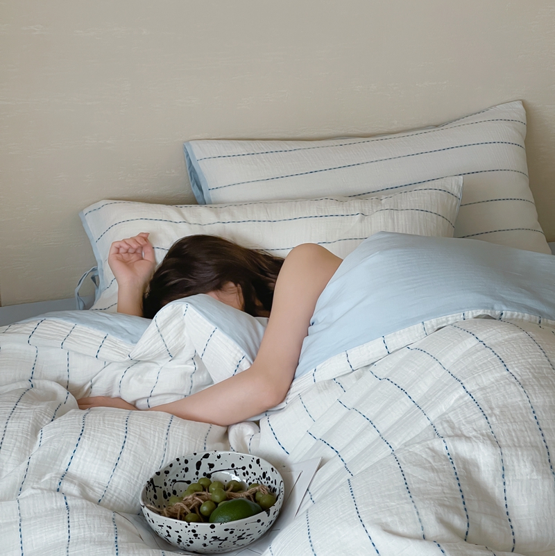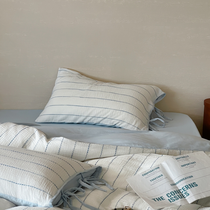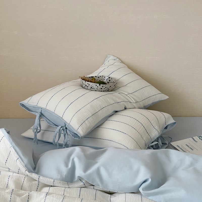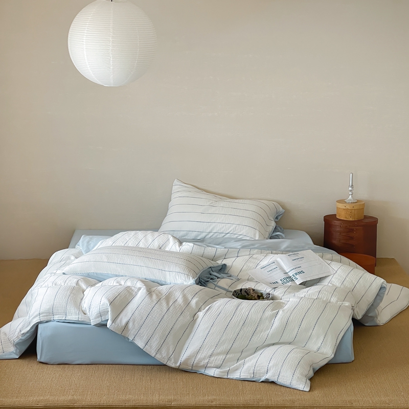 (总)小春日和 2025新款全棉提花条纹四件套纯棉人字纹水洗提花绑带款四件套民宿四件套纯色床单1.8床笠简约被套,云漫