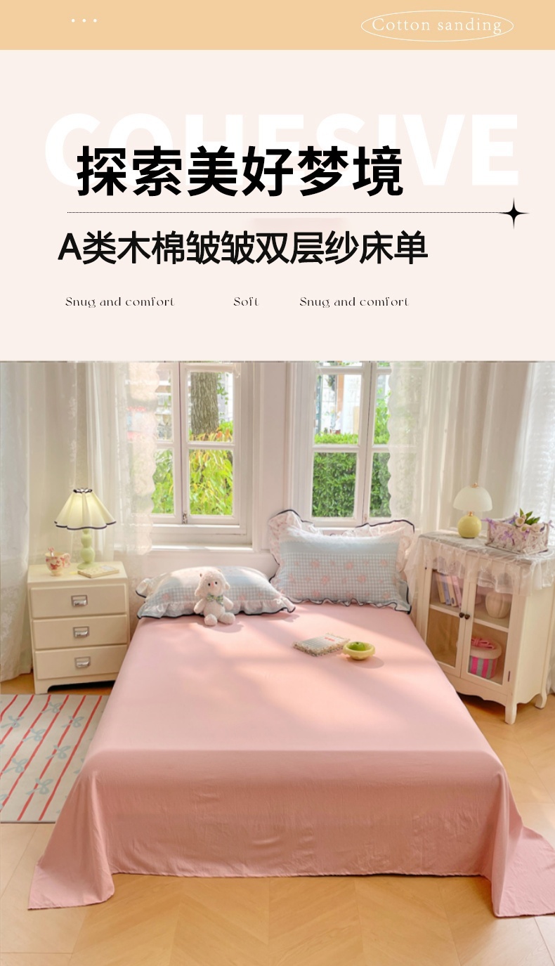 • 91家纺网 家纺一手货源 找家纺 梦舒羽 2025新款皱皱双层纱印花床单 浮生若梦-粉(纯色床单)