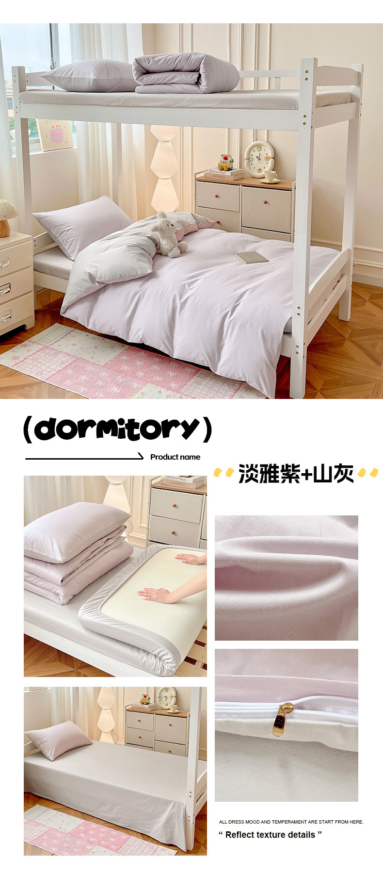 商品名称:泽西家纺 2025新款A类加密全棉40支13376简约风宿舍双拼纯色纯棉学生三件套 微微紫+浅米灰