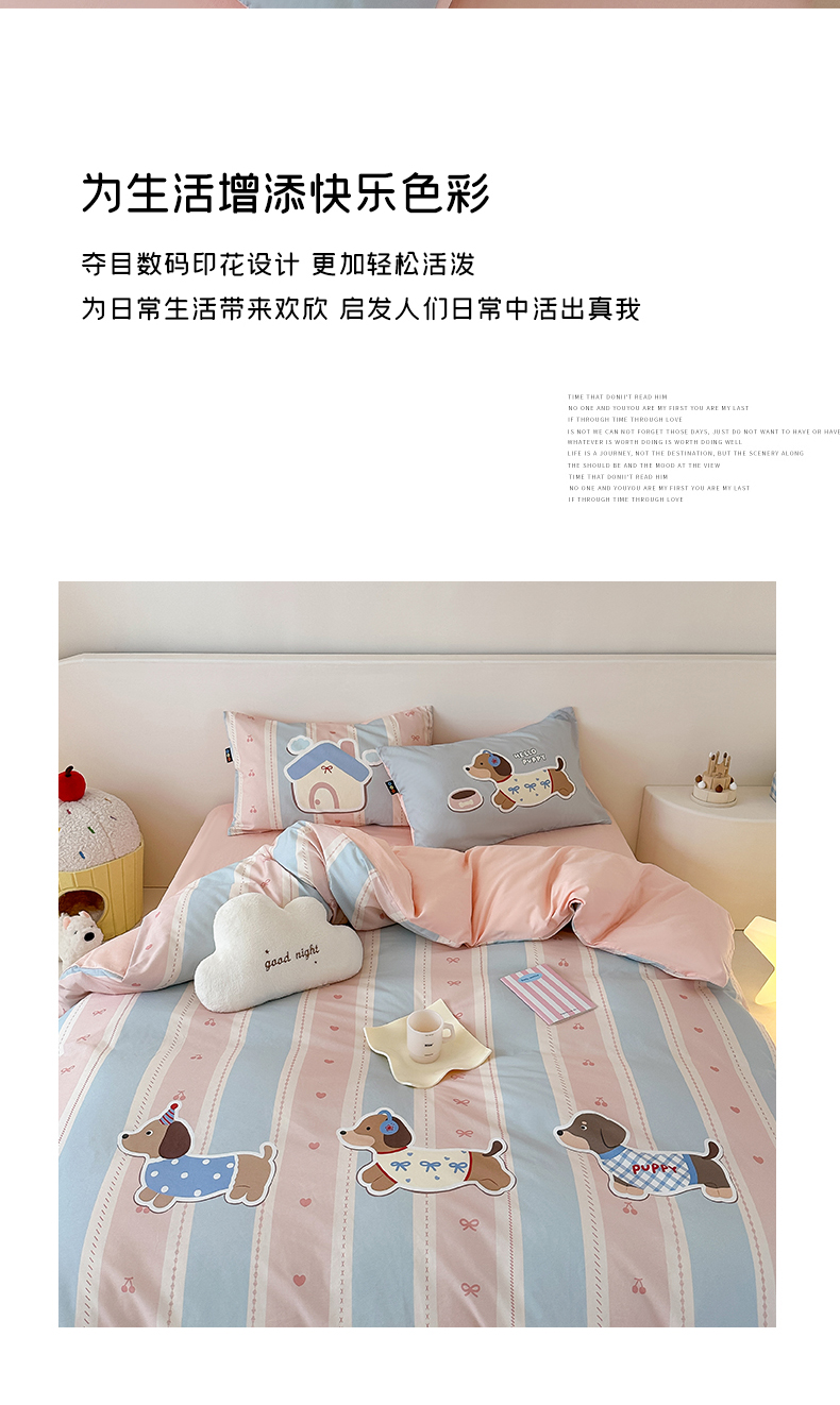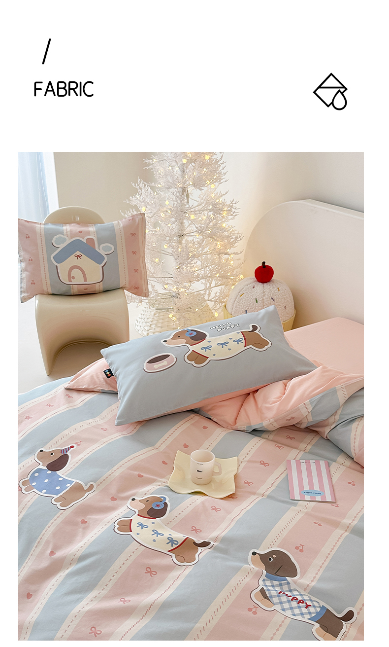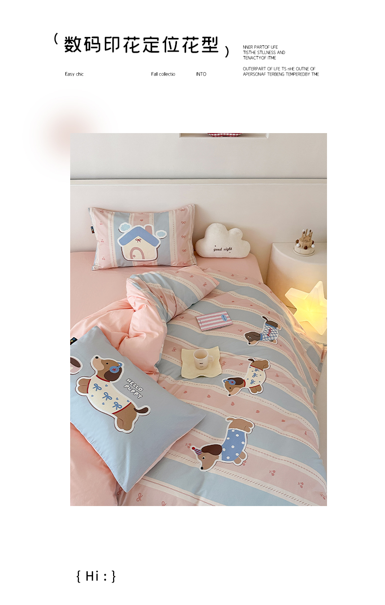 当前位置: 91家纺网 > 商品网购 > 床品套件 > 四件套 > 全棉普通四件套 > RYB红黄兰 开学季2025新款ins设计师原创大版卡通数码印花40s全棉纯棉四件套-场景二 甜心腊肠狗