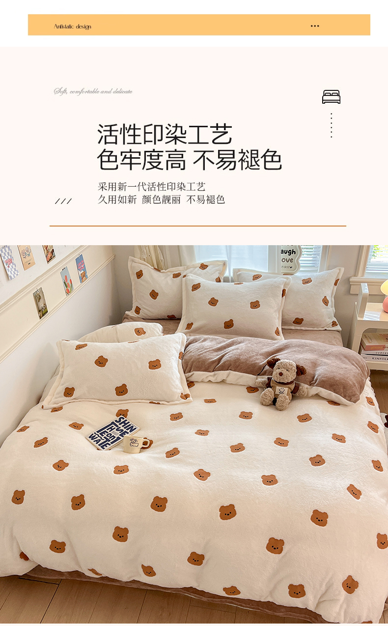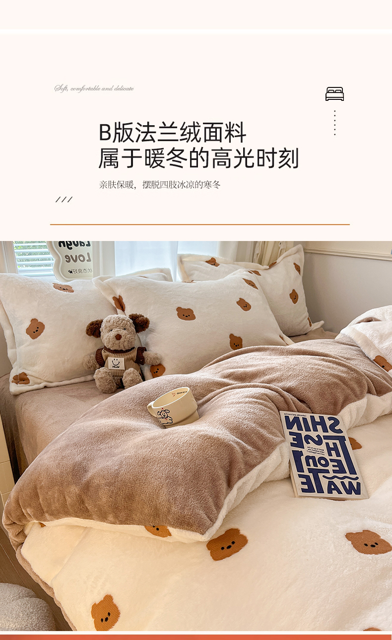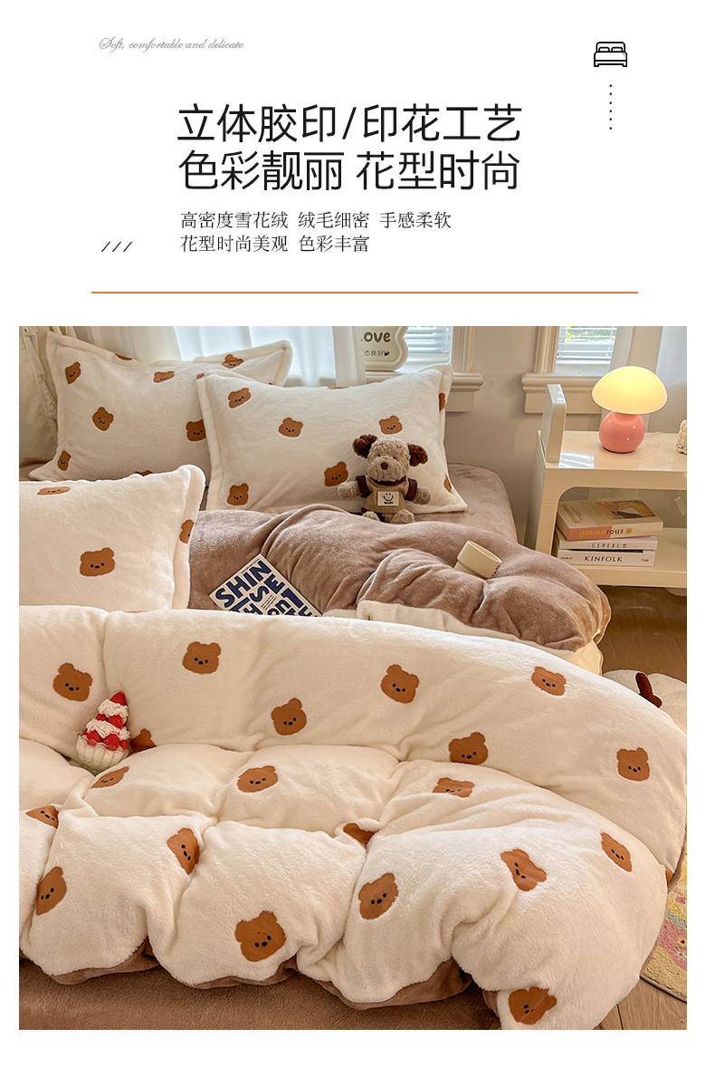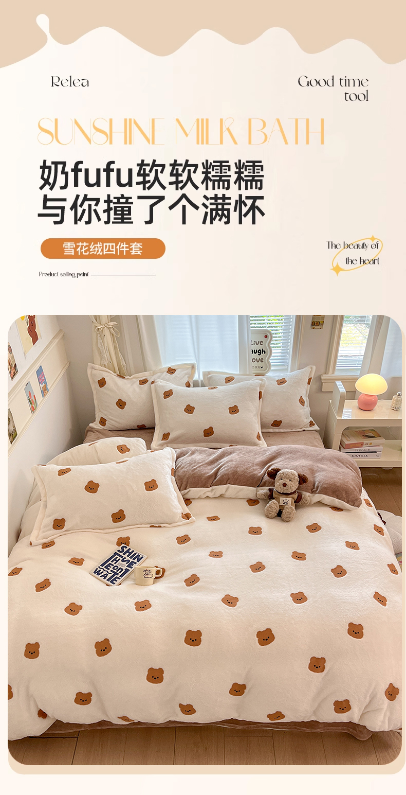 当前位置: 91家纺网 > 商品网购 > 床品套件 > 四件套 > 法莱绒四件套 > 川悦生活2025新款立体雪花绒印花大床四件套系列二场景二 豆奶小熊