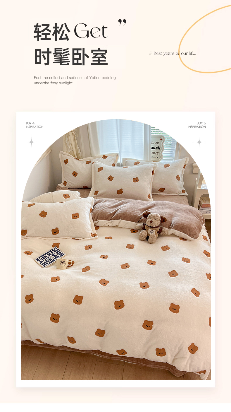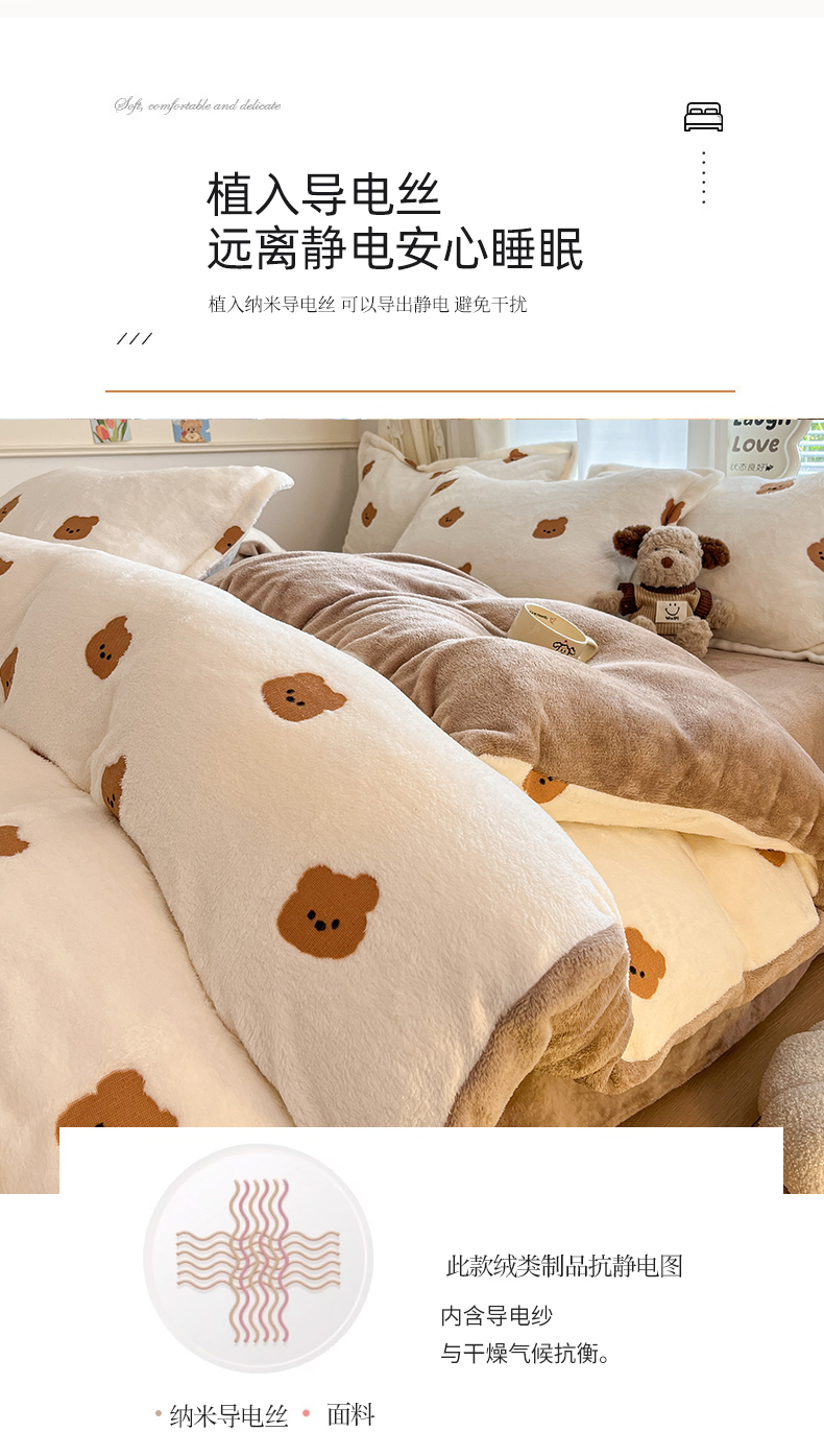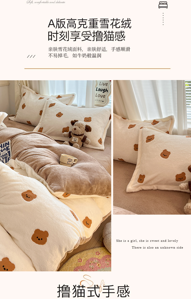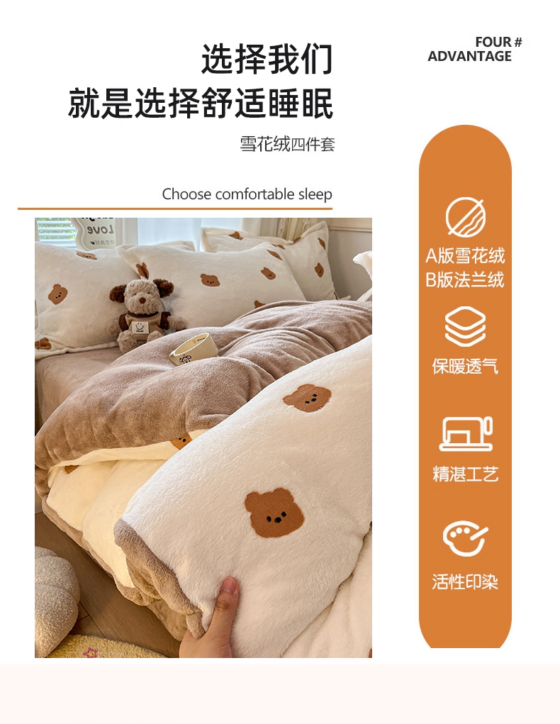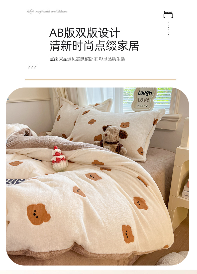 当前位置: 91家纺网 > 商品网购 > 床品套件 > 四件套 > 法莱绒四件套 > 川悦生活2025新款立体雪花绒印花大床四件套系列二场景二 豆奶小熊