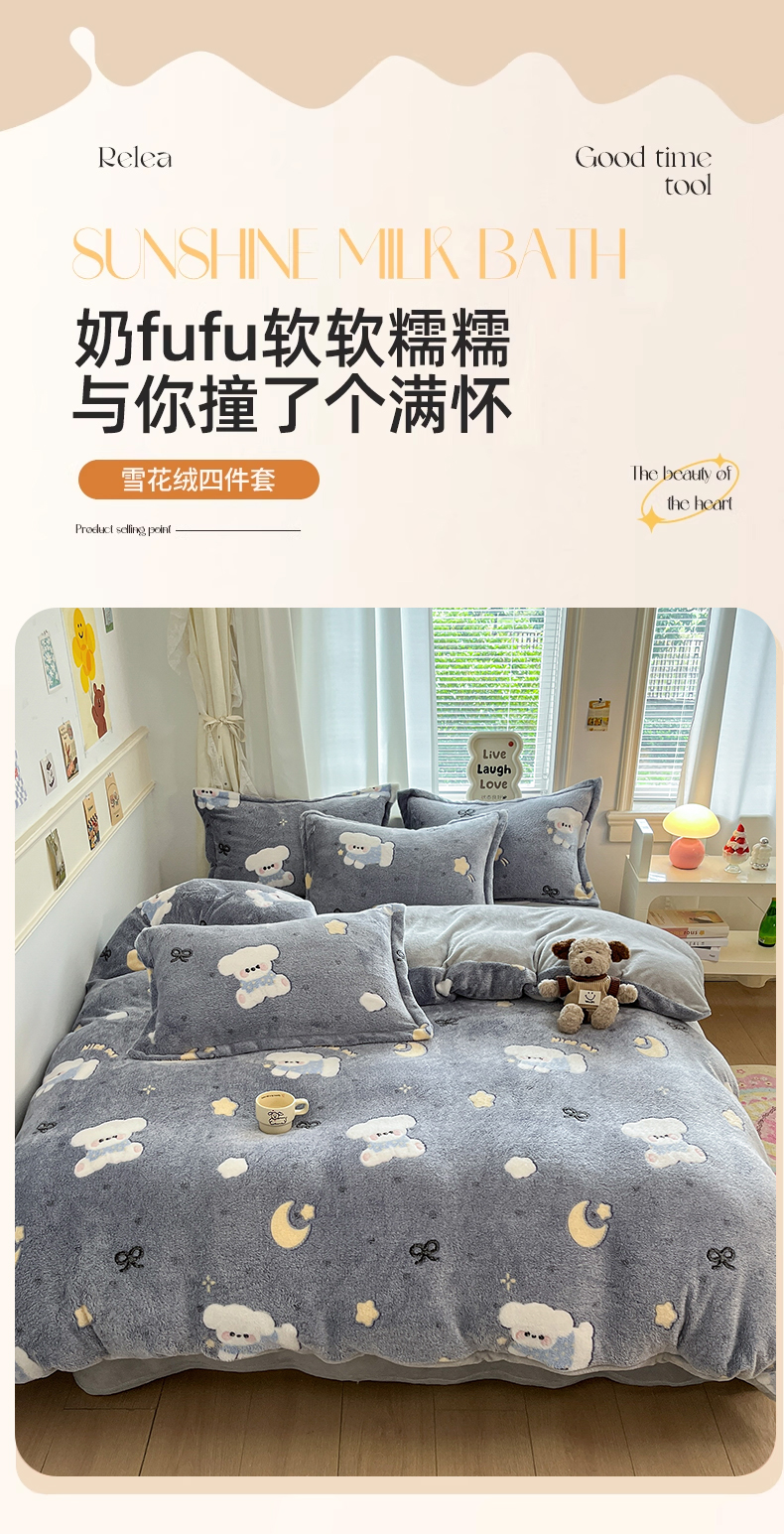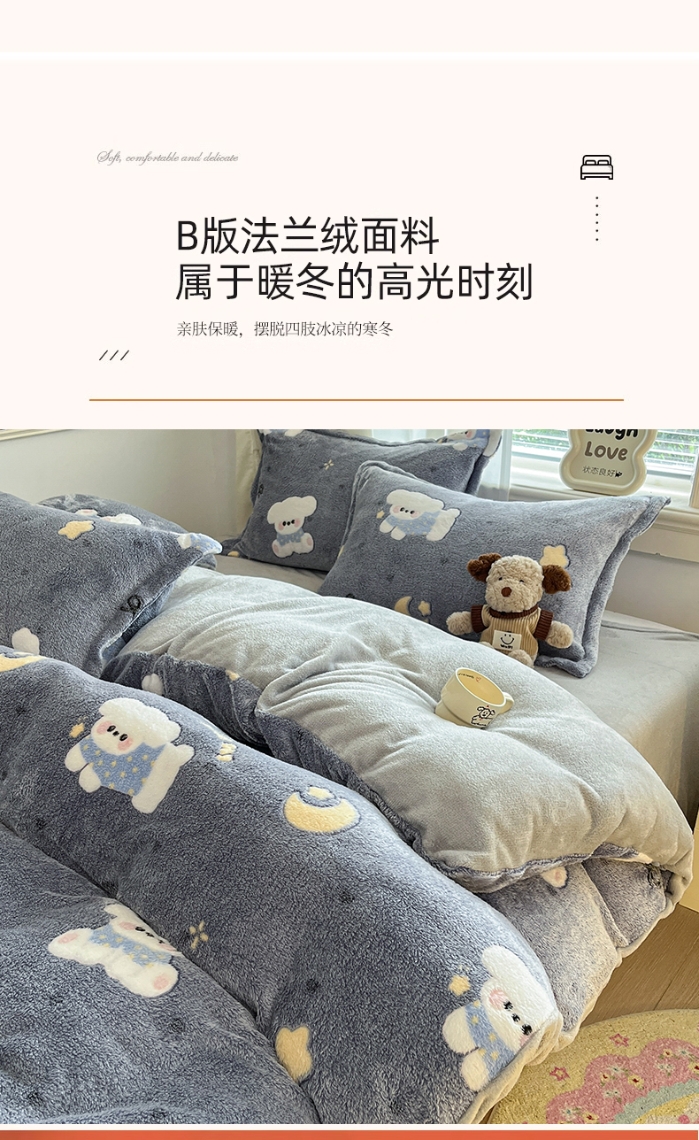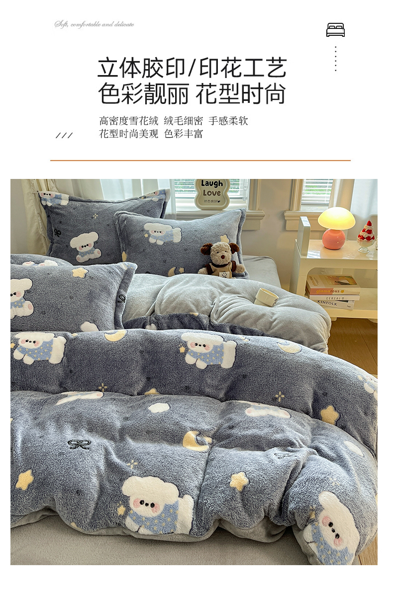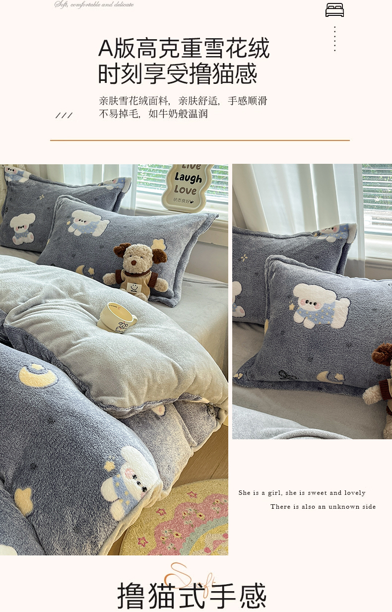 当前位置: 91家纺网 > 商品网购 > 床品套件 > 四件套 > 法莱绒四件套 > 川悦生活2025新款立体雪花绒印花大床四件套系列二场景二 星月小狗-灰