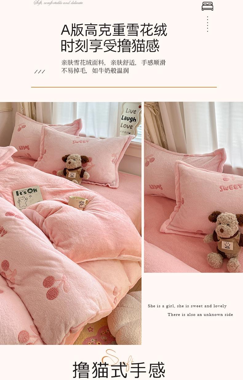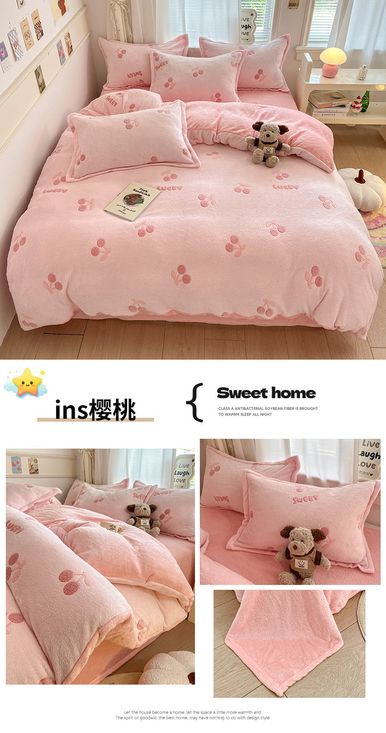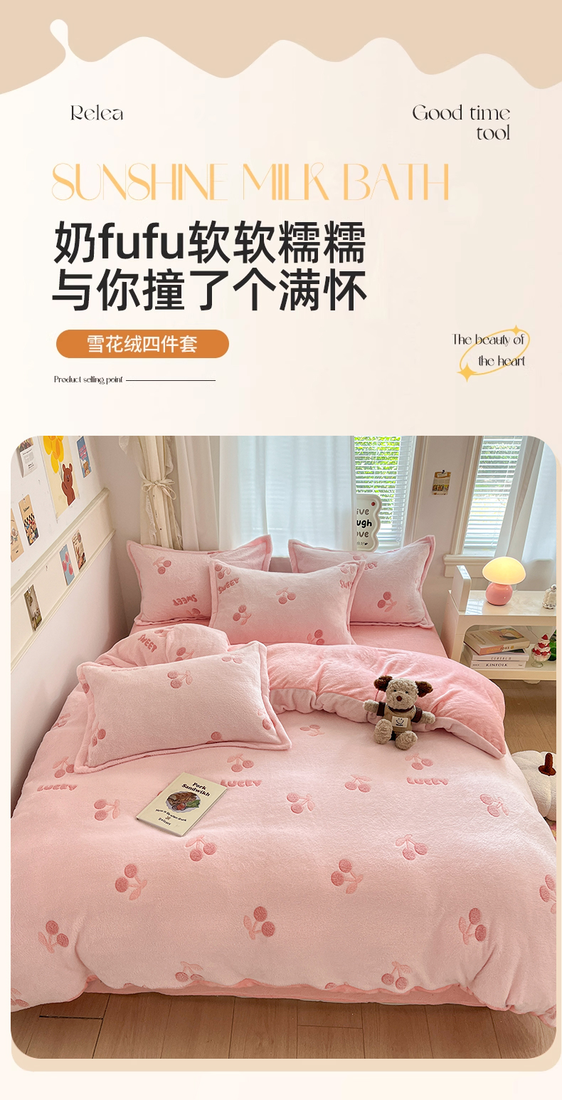 当前位置: 91家纺网 > 商品网购 > 床品套件 > 四件套 > 法莱绒四件套 > 川悦生活 2025新款立体雪花绒印花大床四件套系列一场景二 ins樱桃