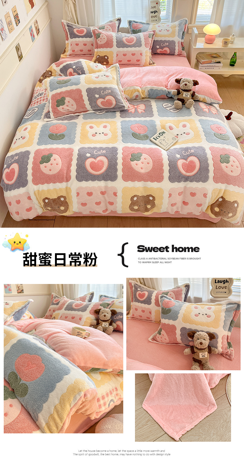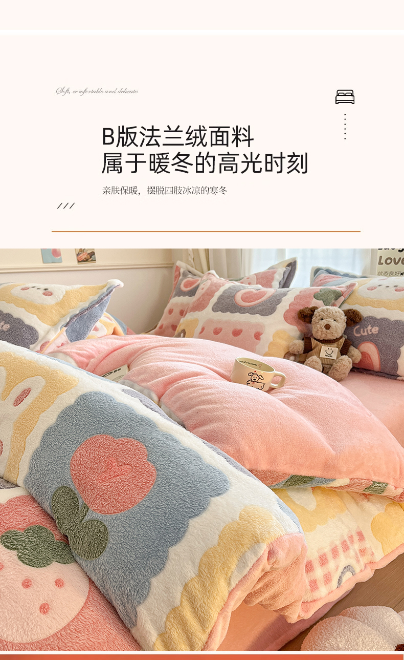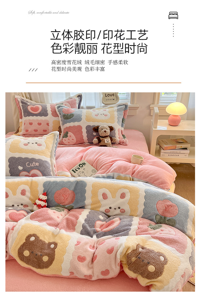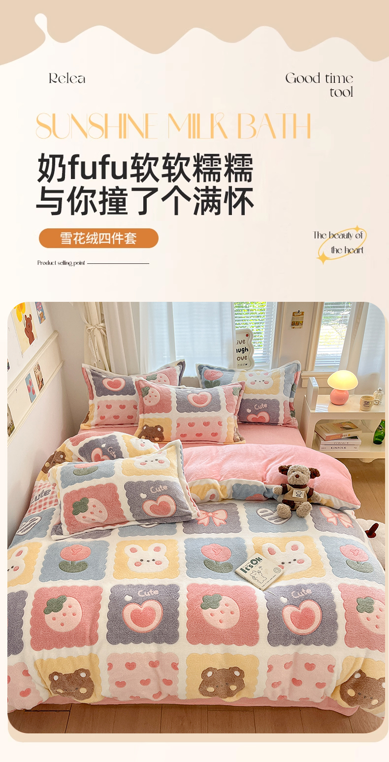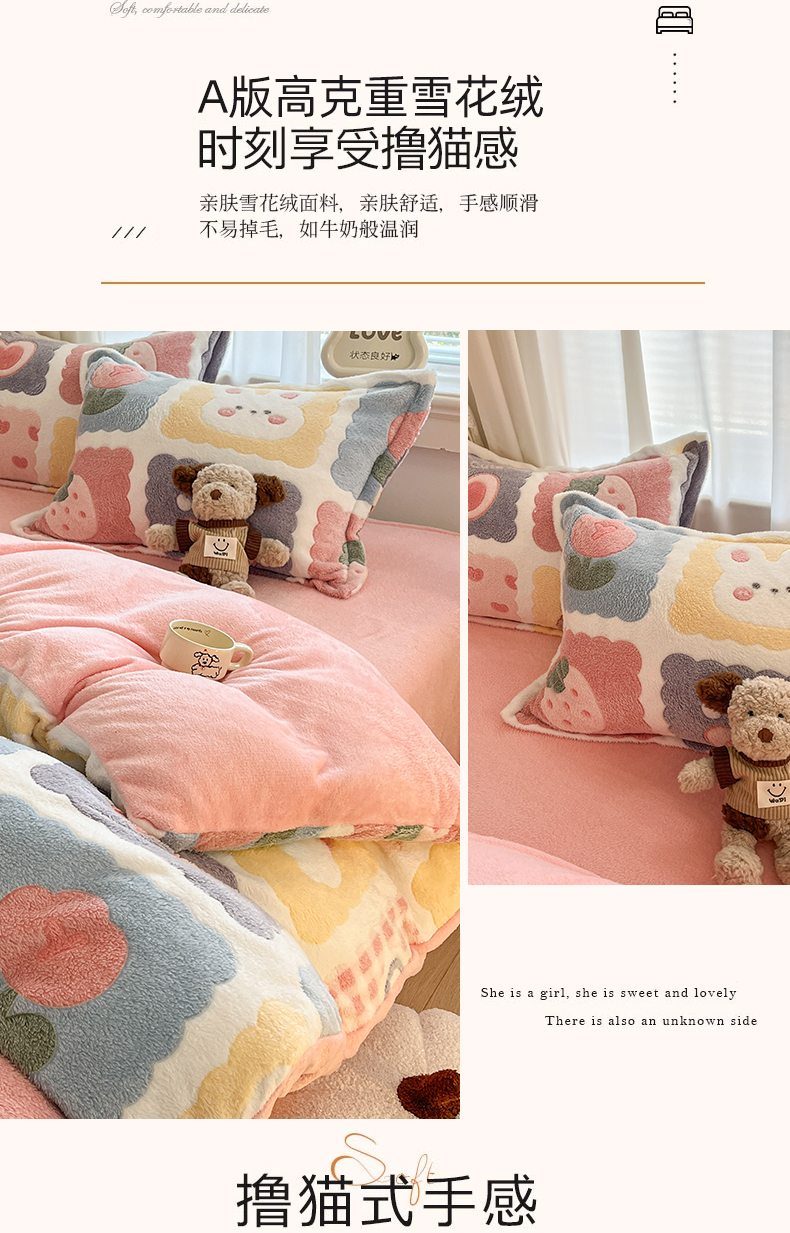 当前位置: 91家纺网 > 商品网购 > 床品套件 > 四件套 > 法莱绒四件套 > 川悦生活 2025新款立体雪花绒印花大床四件套系列一场景二 甜蜜日常粉