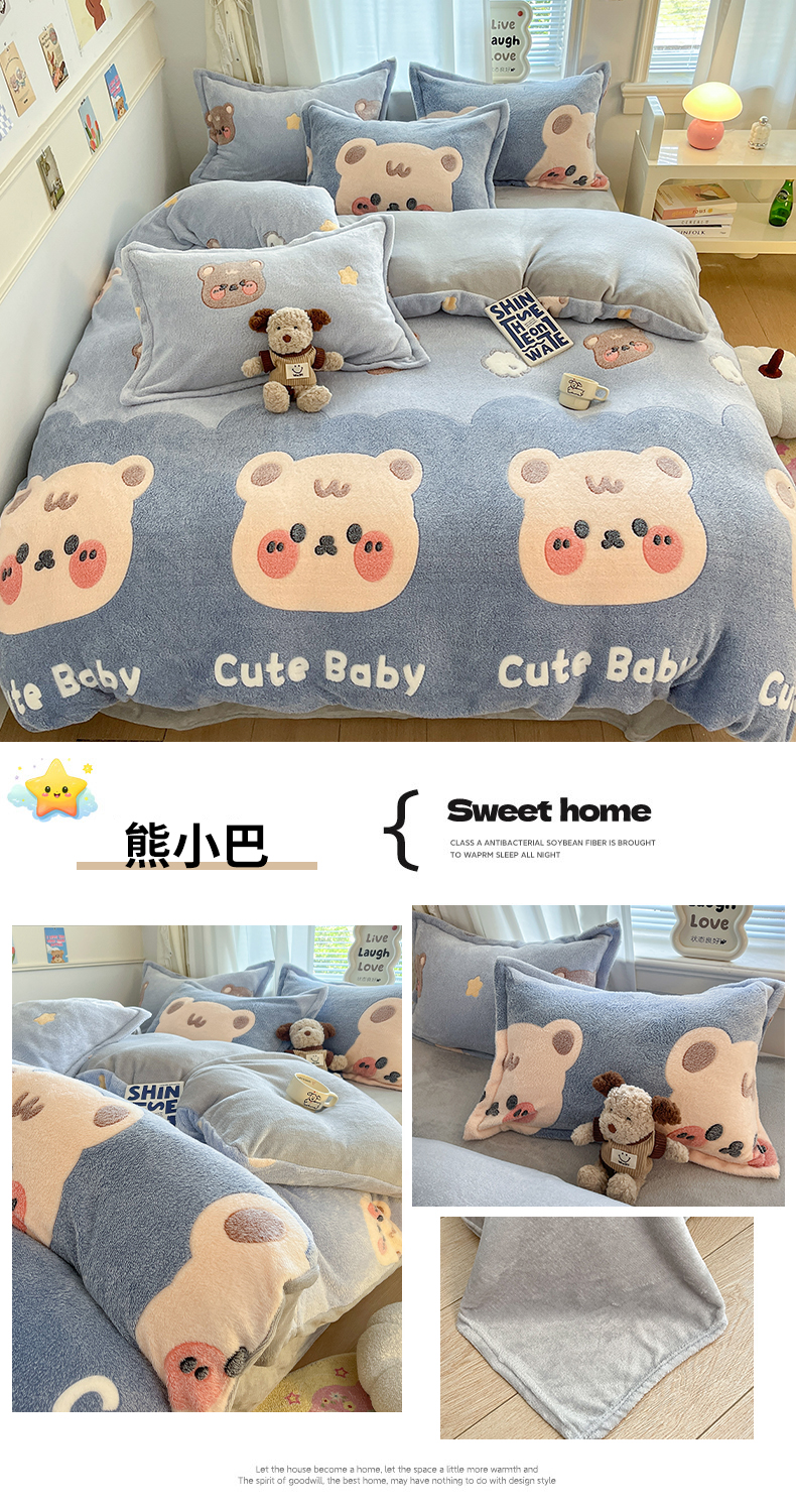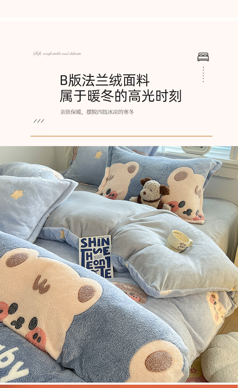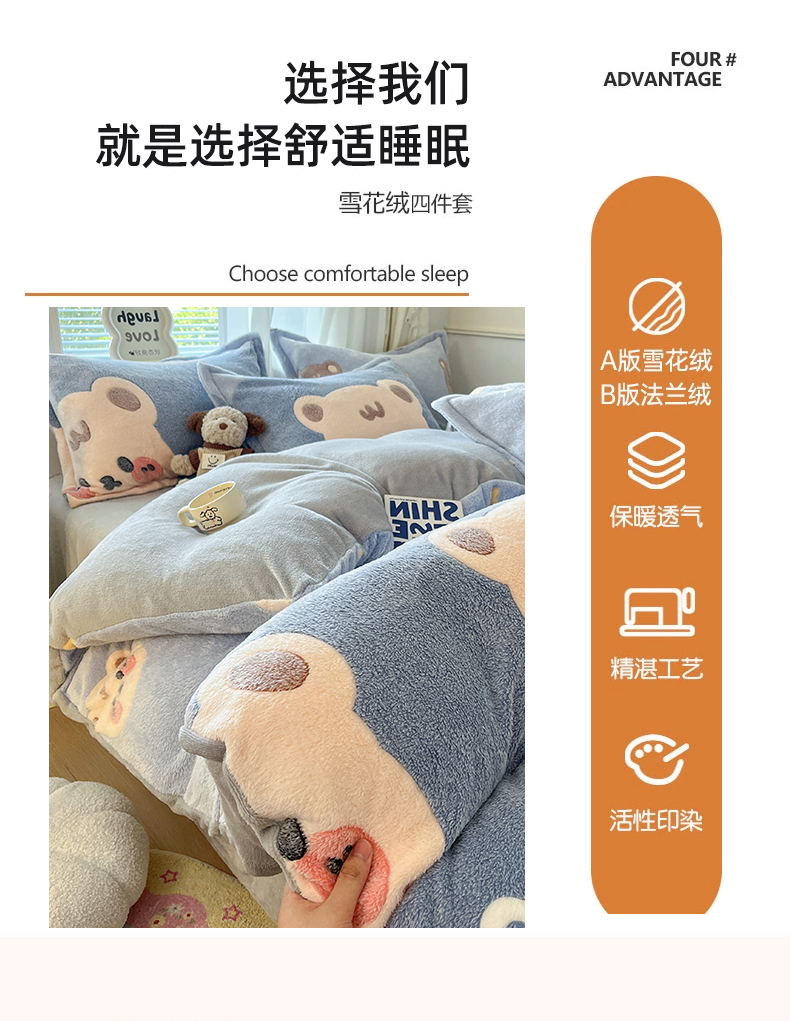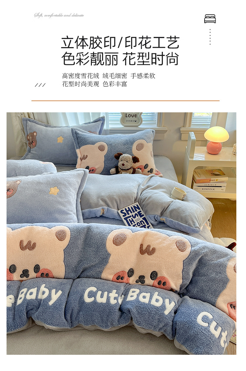 当前位置: 91家纺网 > 商品网购 > 床品套件 > 四件套 > 法莱绒四件套 > 川悦生活 2025新款立体雪花绒印花大床四件套系列一场景二 熊小巴